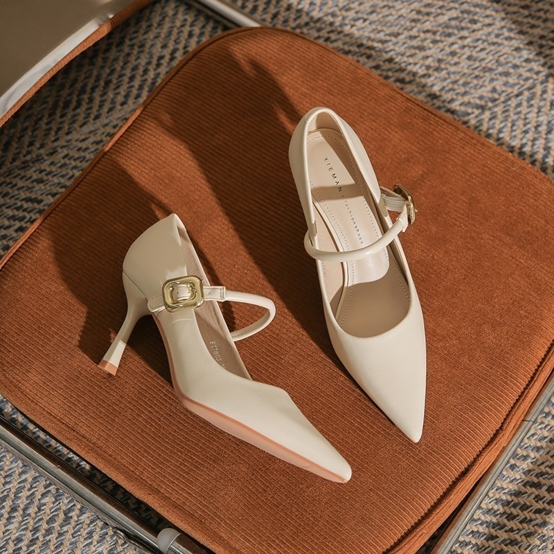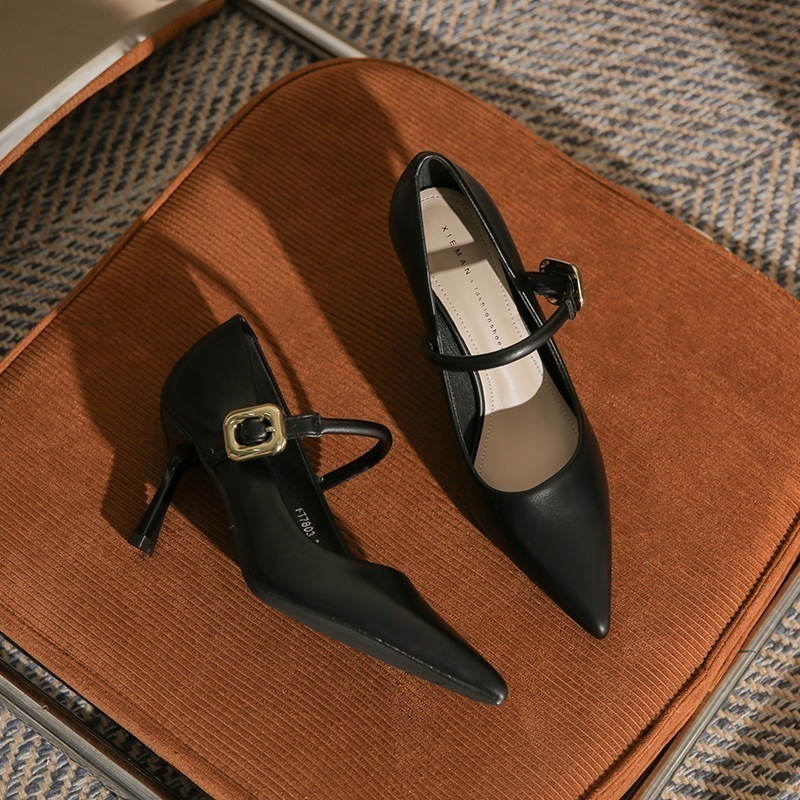 ポインテッドトゥメリージェーンシューズ2023ファインヒールソフトレザーワンワードバックルストラップファッションハイヒールミディアム