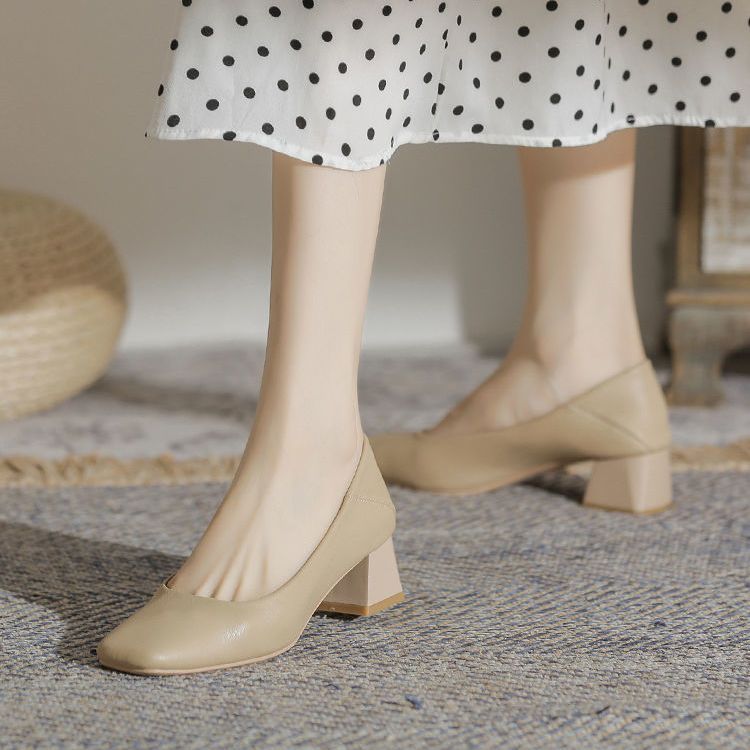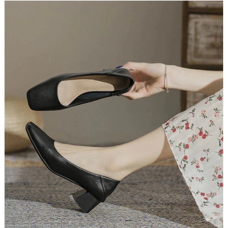2022スクエアヘッド厚いヒールシングルシューズ浅い口通勤ハイヒール