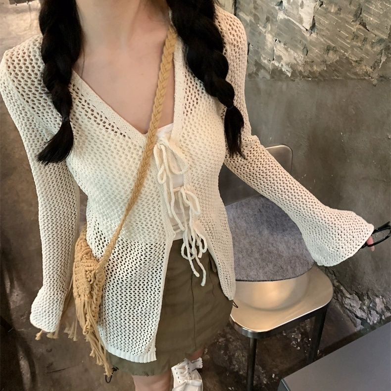 レディース UVカット カーディガン 透かし編み ベルト付き カレッジ風 長袖 薄手 通気性 日焼け防止 夏新作 韓国ファッション おしゃれ 人気アイテム