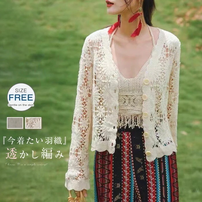 カーディガン サマーニット レディース 春 夏 さっと羽織れる 透かし編み 花柄 ゆったり フェミニン 透かし彫り 着回し 透け感 高見え シェルボタン Vネック 長袖 薄手 カジュアル 体型カバー
