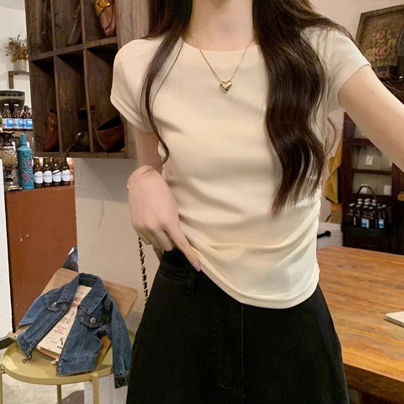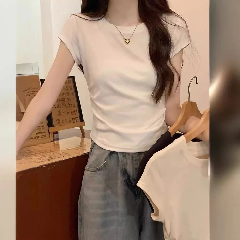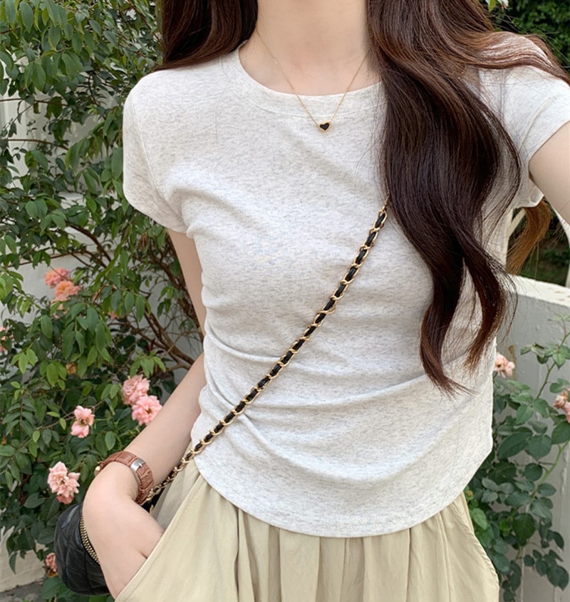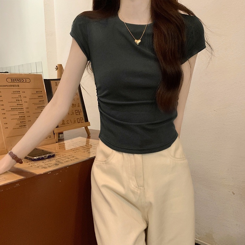 Tシャツ デザイン感 プリーツショルダー 半袖 インナーセクシー カーディガンフィット トップス レディース 韓国ファッション Tシャツ カットソー