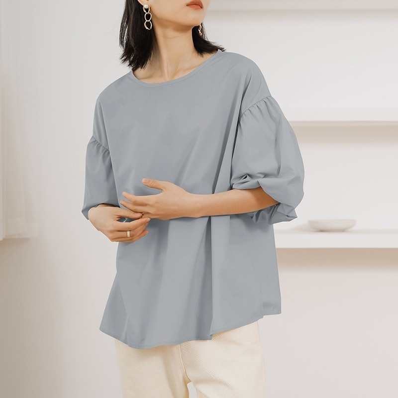 日韓風 夏用ゆったり大サイズレディースシャツ コットン素材 オーバーサイズベルスリーブ 丸首トップスシャツ シフォンシャツ シャツ ブラウス