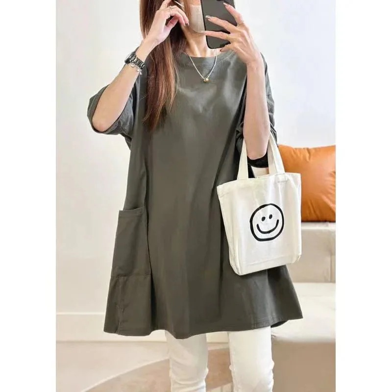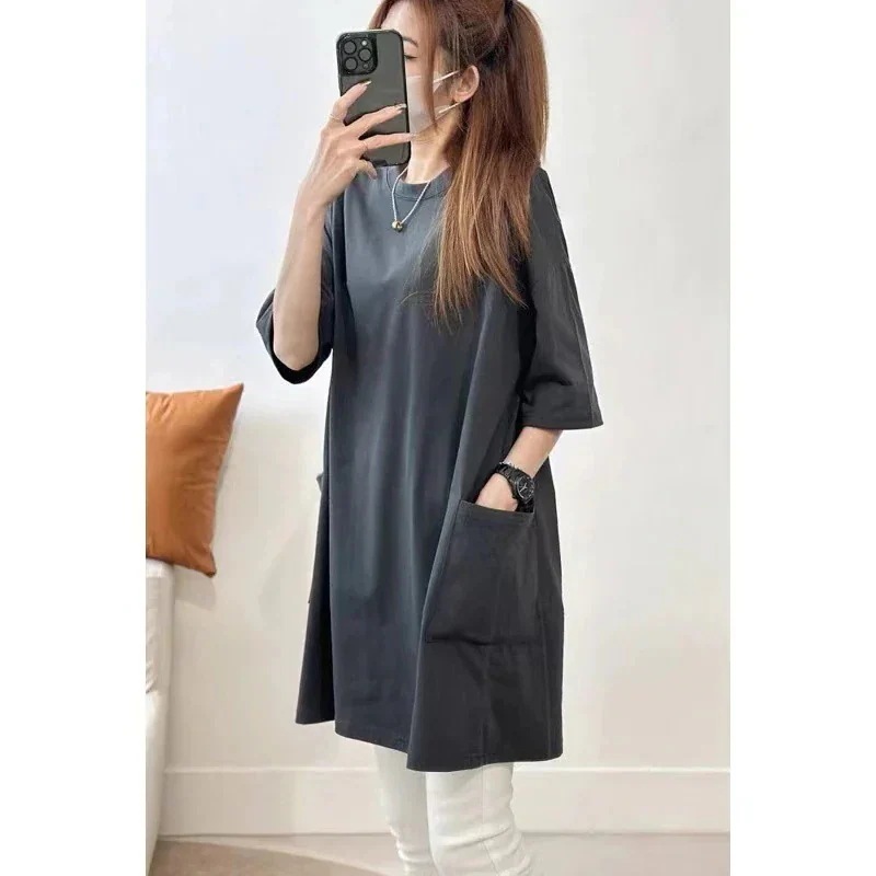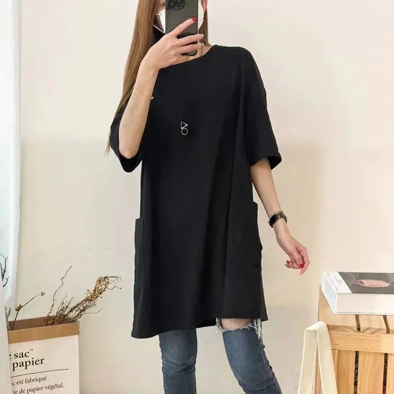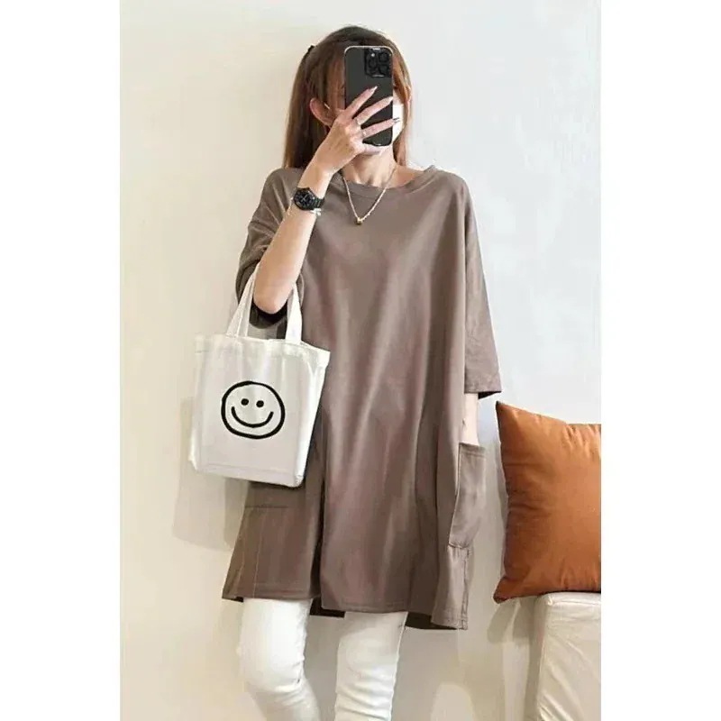 韓国ファッション 半袖 レディース ゆったりロング T シャツ 無地 クルーネック 大きいサイズ ゆったりトップス 体型カバー 着痩せ カジュアル 春 夏