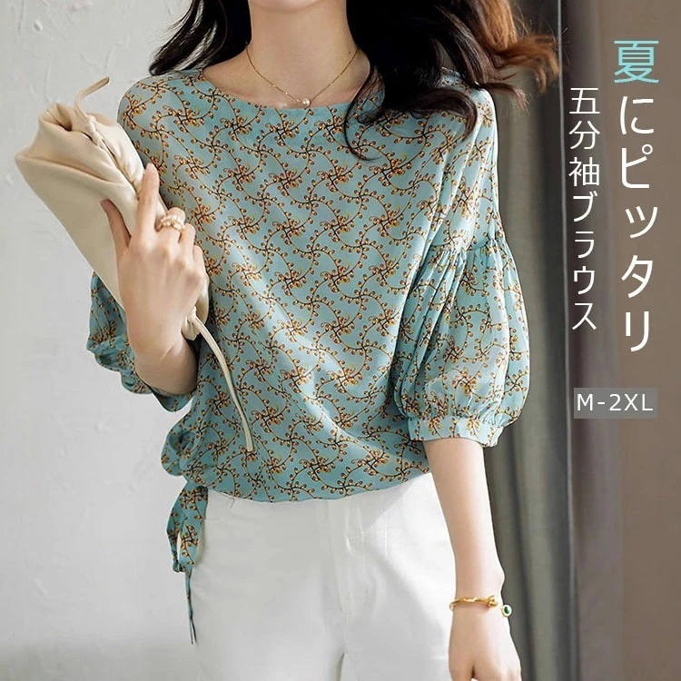 ブラウス 半袖 レディース 春 夏 トップス 花柄 コクーンスリーブ バルーンスリーブ 七分袖 ボリューム袖 ゆったり 花柄トップス 体型カバー クルーネック ボリュ