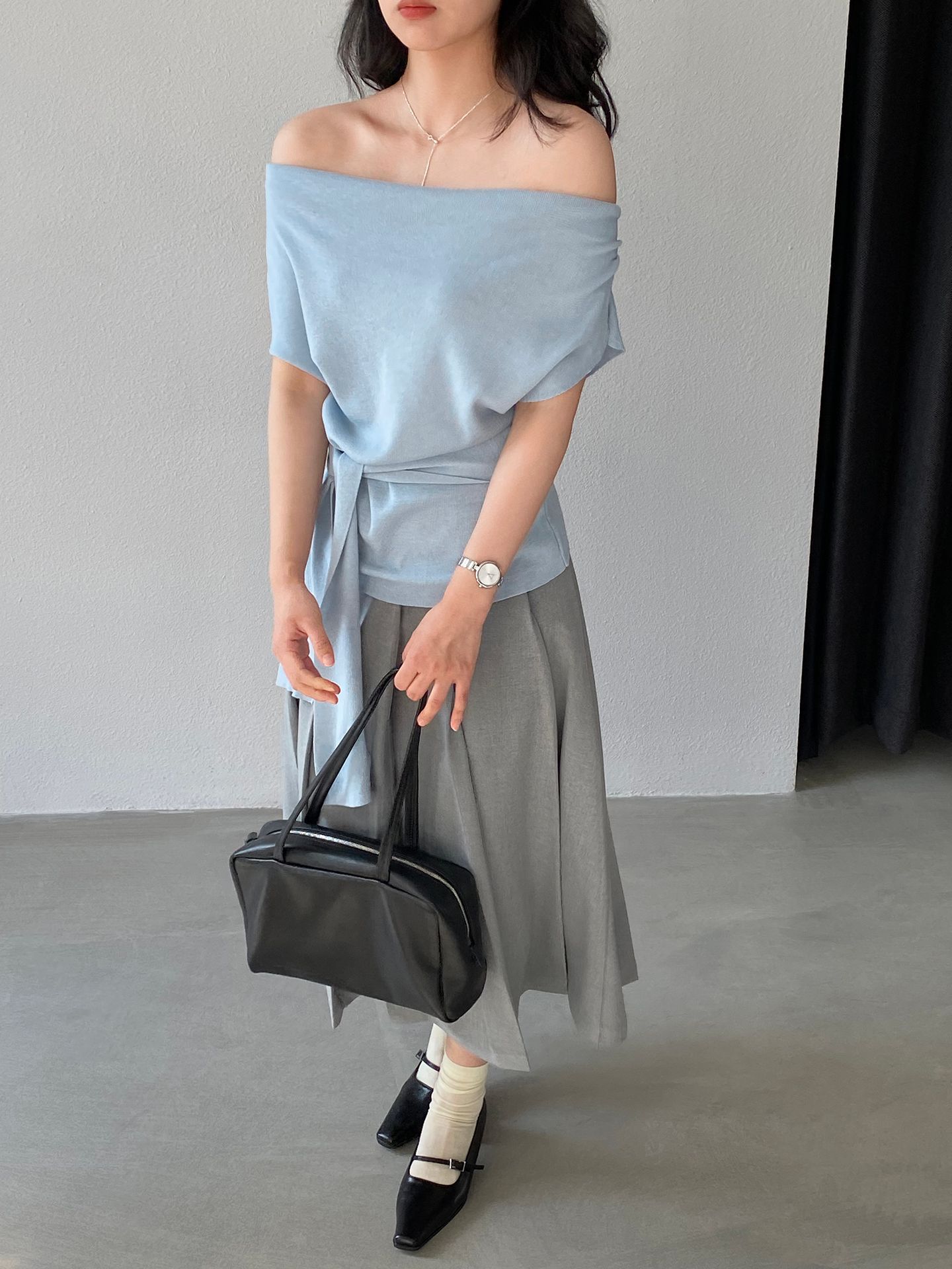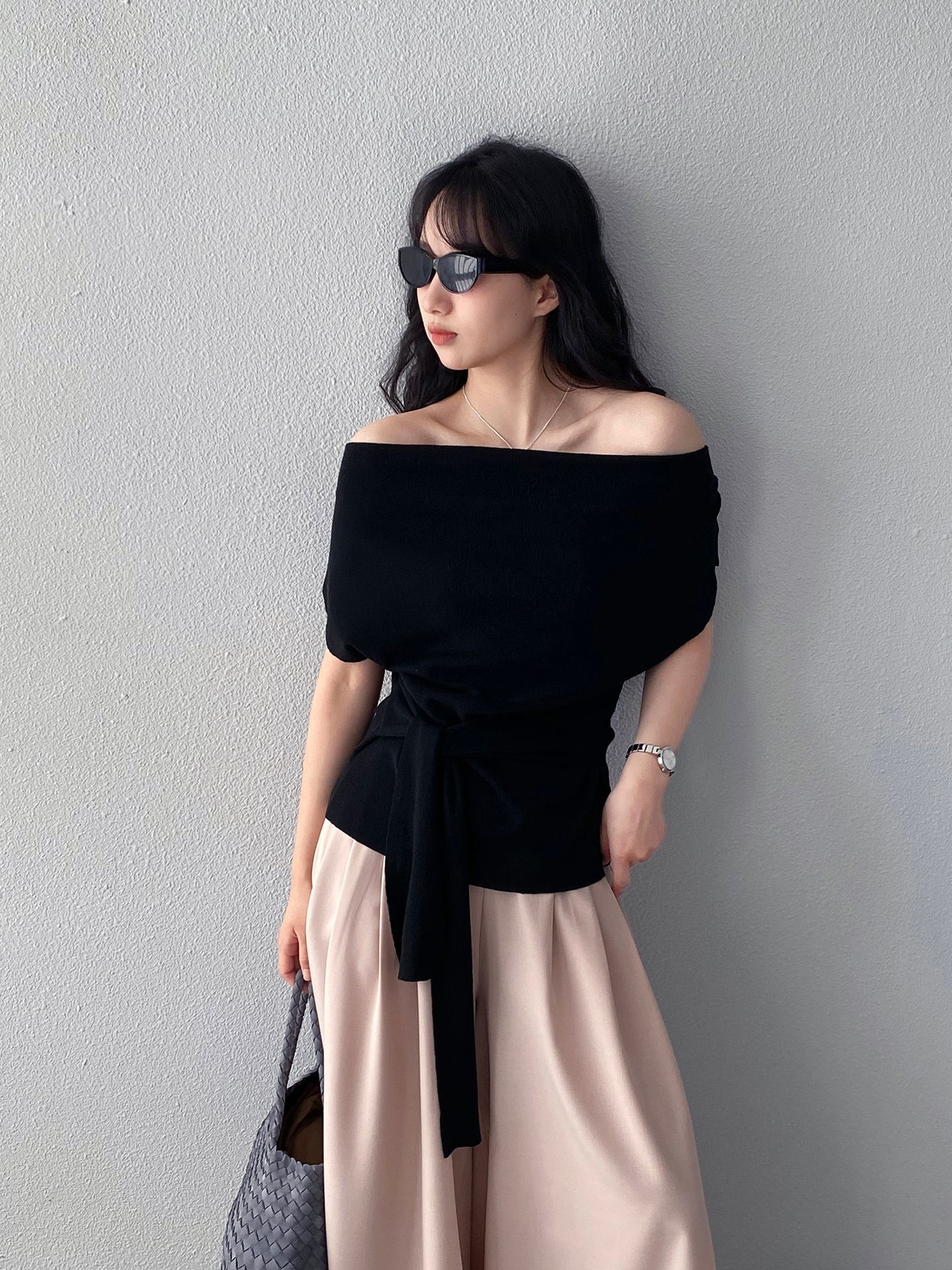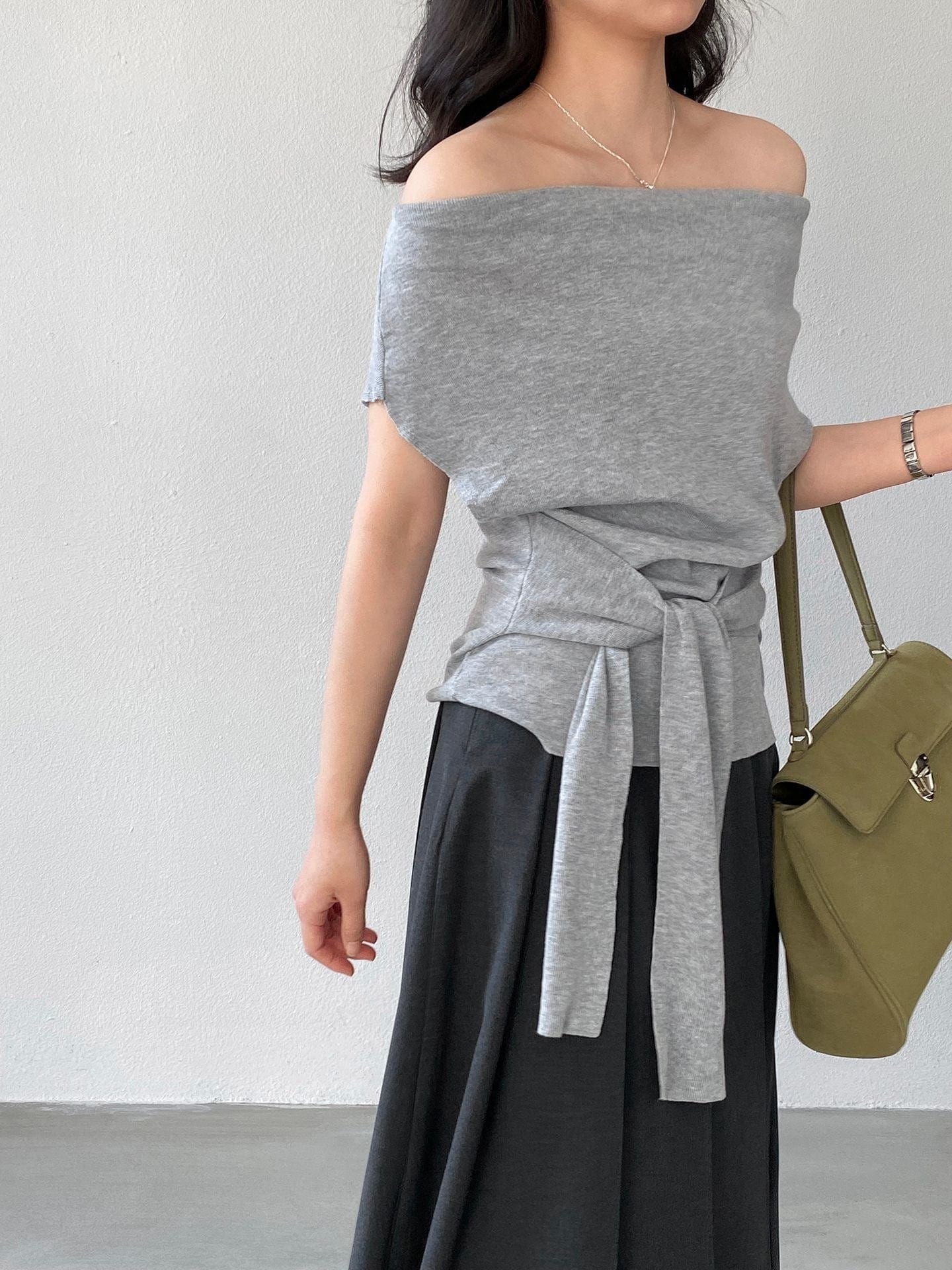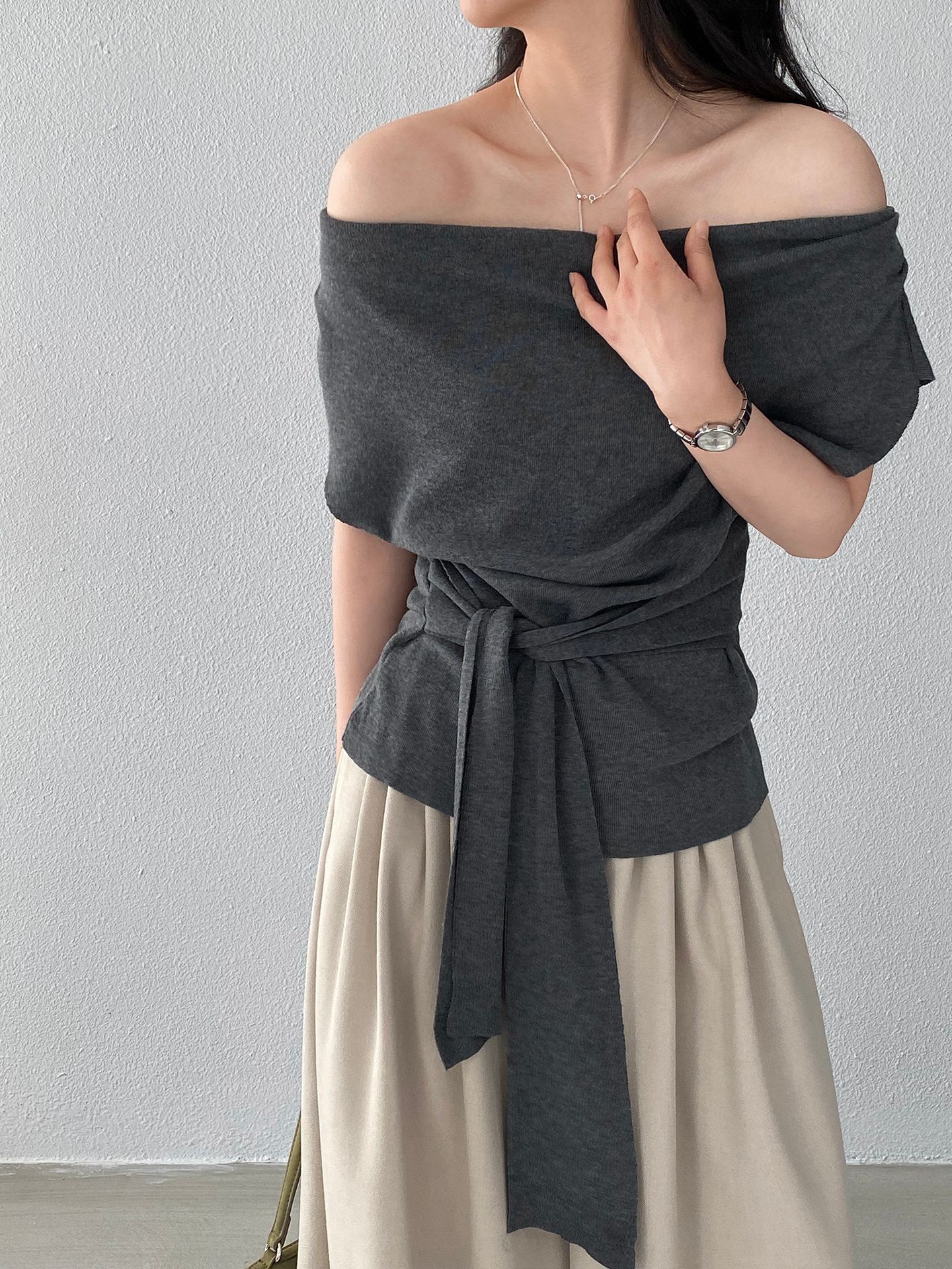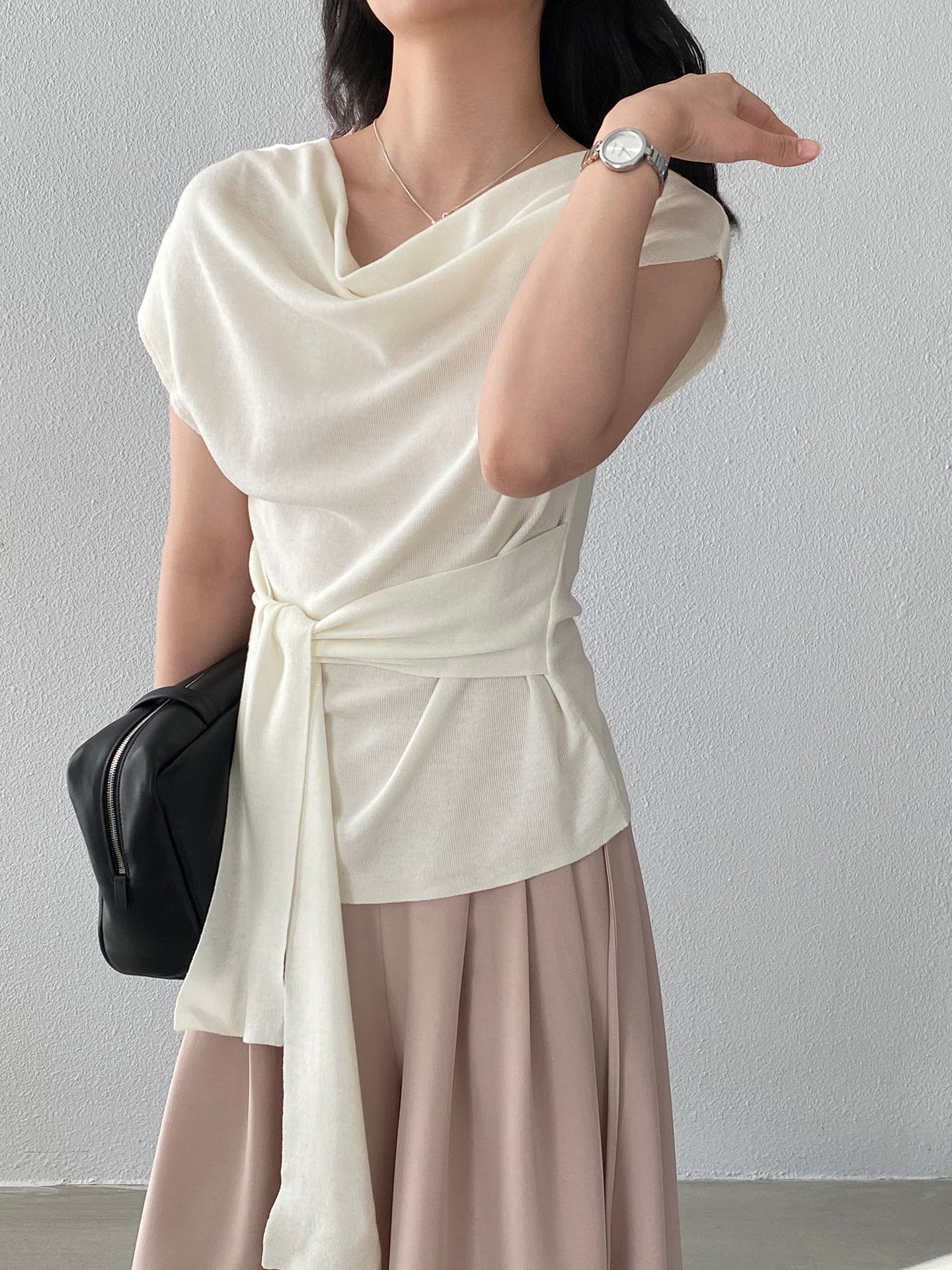 【シャツ】韓国 上品 シンプル Vネック ニット 半袖 レディース モカグリーン アシンメトリー リボン スリム効果 Tシャツ