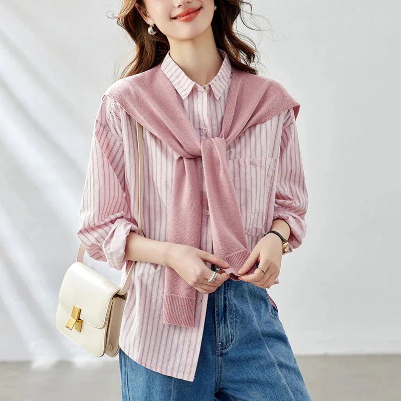 【シャツ】ピンク ストライプ シャツ レディース 長袖 2026新作 トップス ニット ショール トップス デザイン性 レディース ブラウス