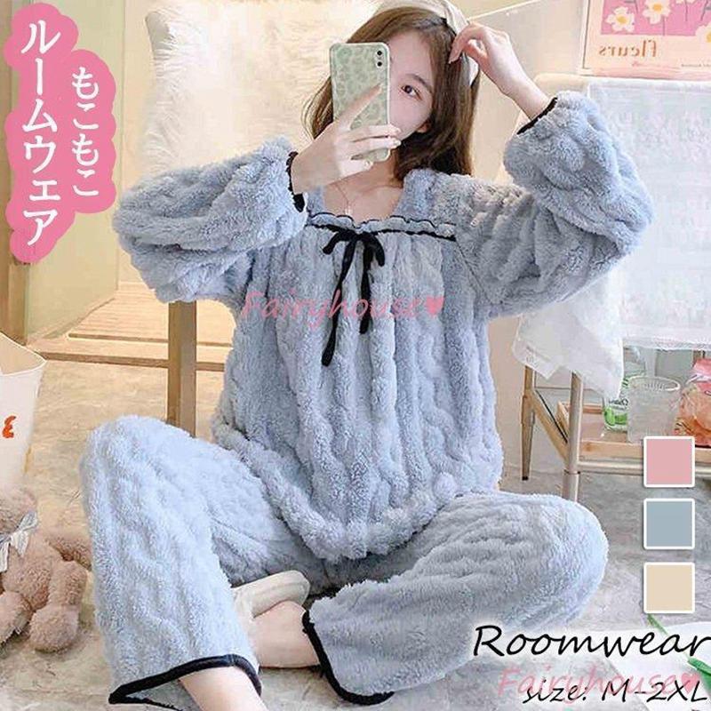 パジャマ モコモコウェア レディース 長袖パジャマ リボン可愛い無地 フランネルウェア 暖かい 上下セット 厚手 部屋着 ゆったり韓国風 オシャレ