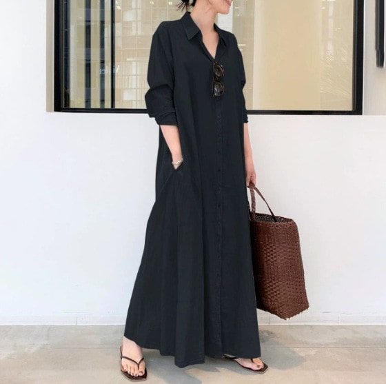 シャツワンピース 春夏新作無地 シンプルゆったり カジュアル 襟付き 長袖 ポケット付き ロングワンピース レディース大きいサイズ