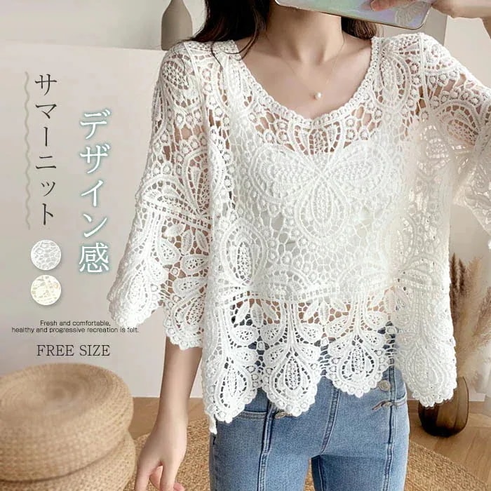 初秋 長袖 ブラウス 透かし編み ニット レディース 夏 ブラウス レース 刺繍 七分袖 トップス 重ね着 透け感 肌見せ サマーニット メッシュ ショート丈 白ブラウス 夏 カジュアル 大人