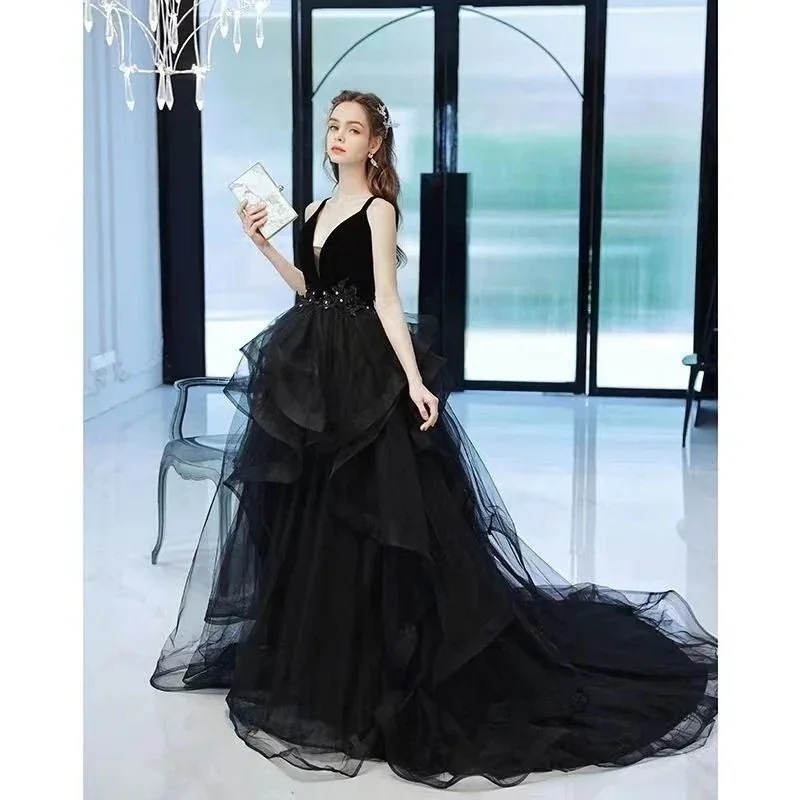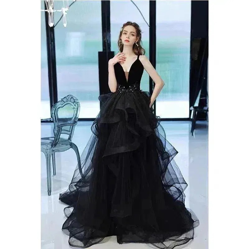 礼服 演奏会/ロングドレス韓国ファッション/入学式/卒業式 礼服 ブラックイブニングドレスホスト卒業気質誕生日ドレス成人式
