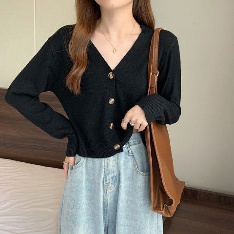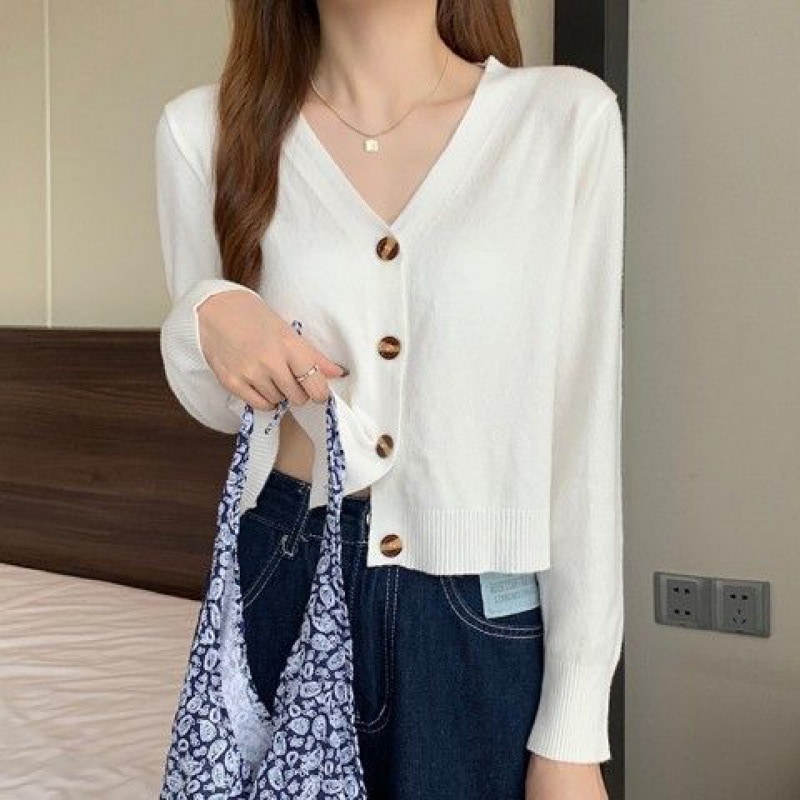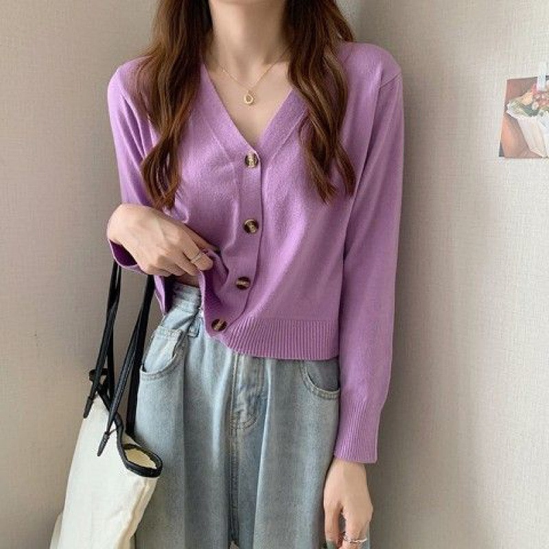 春 秋新作 シンプル 無地 V ネック ニットカーディガン レディース ショート丈 スリム インナー アウター トップス