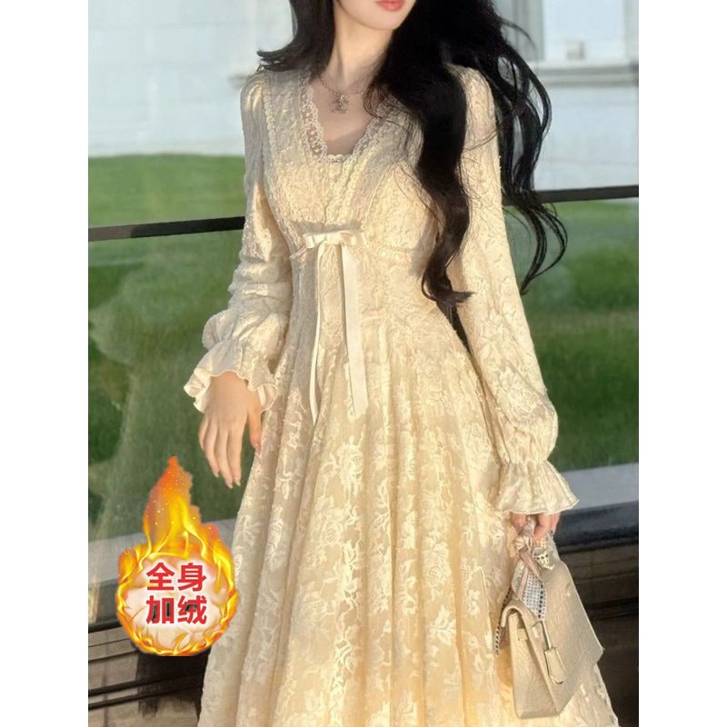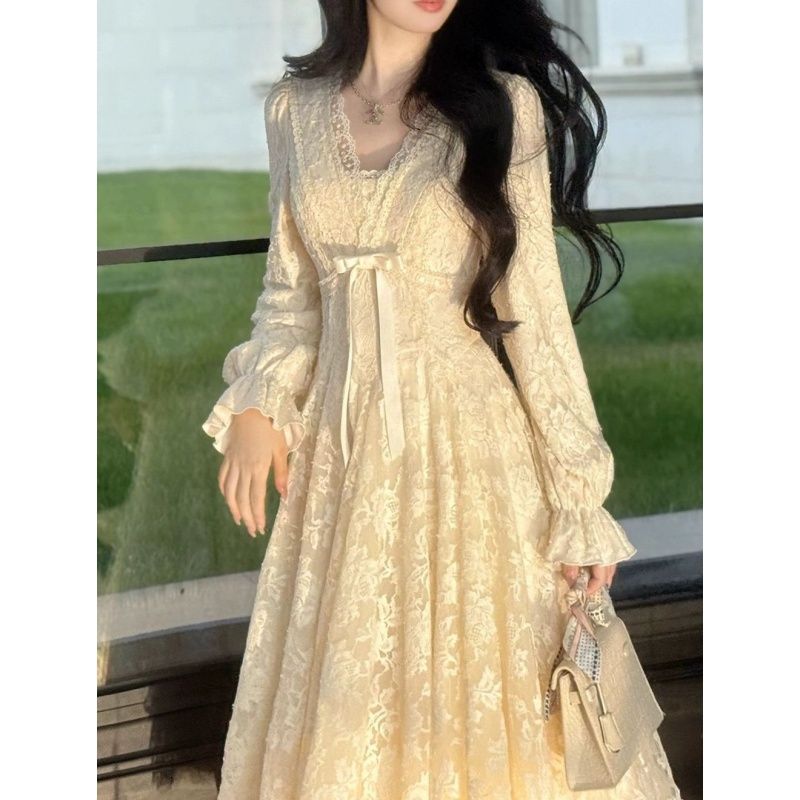 フレンチ Vネック レースワンピース ウエストマーク パフスカート 新作