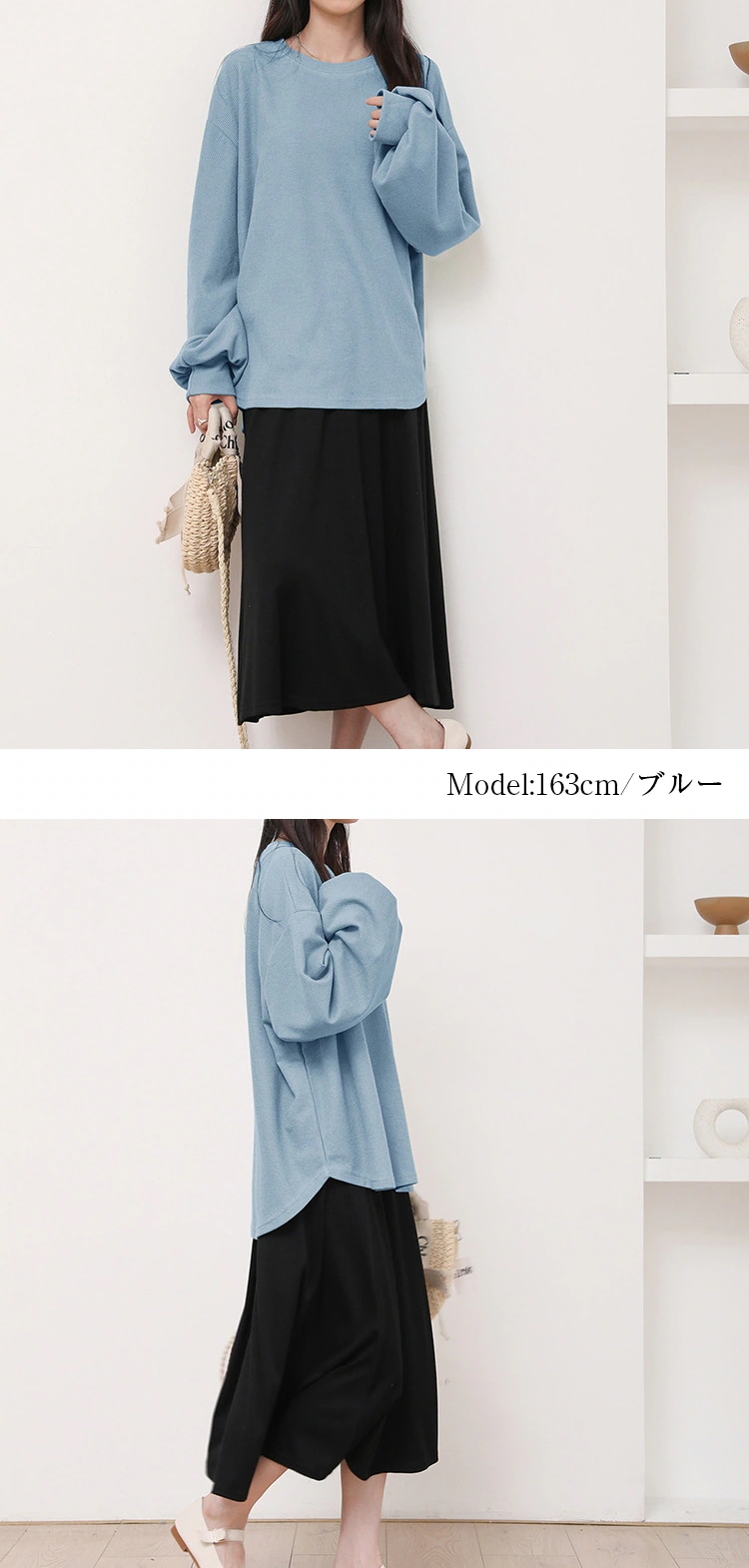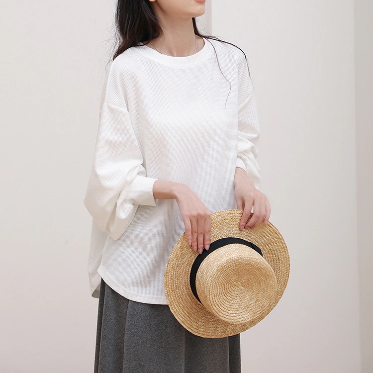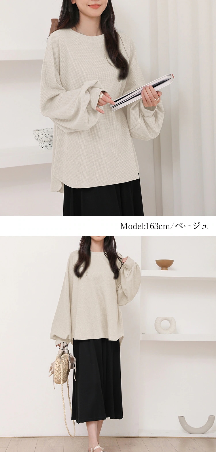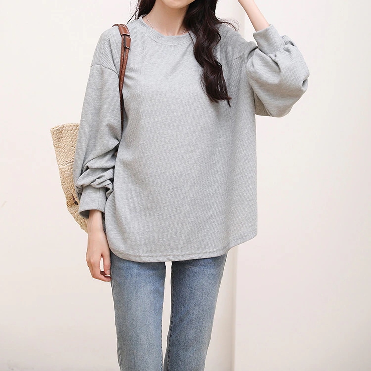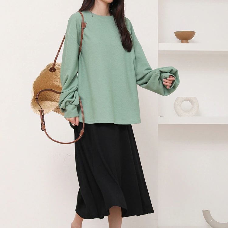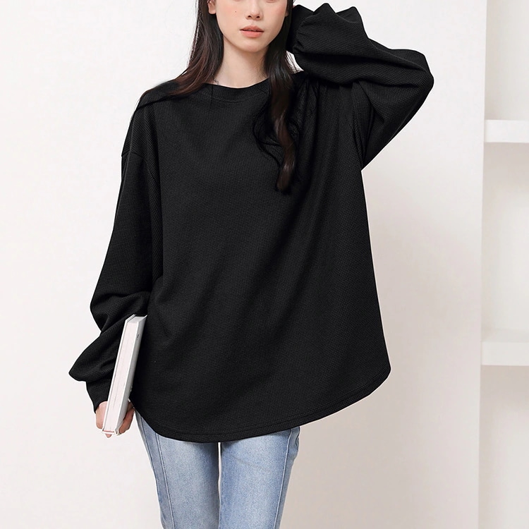 カットソー 長袖 レディース 春 夏 ラウンドネック ボリューム袖 ラウンドヘムtシャツ トップス ワッフルトップス ドロップショルダーロンT お洒落 シンプル 楽ちん 着回し 柔らかい