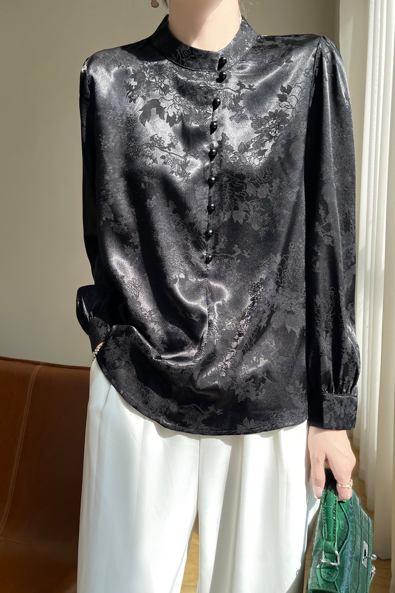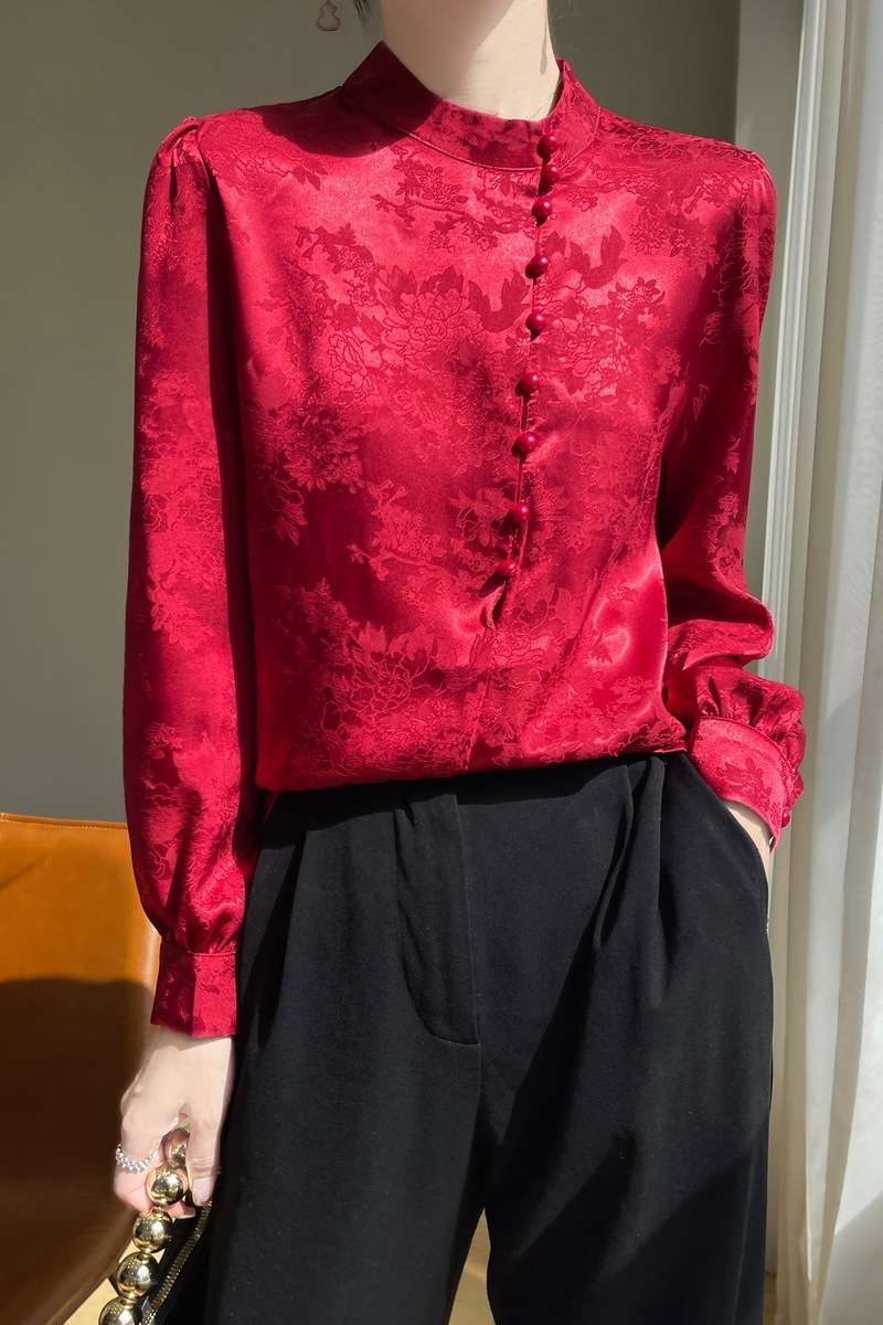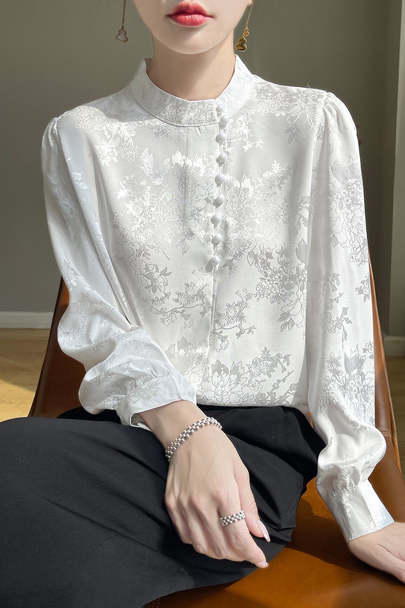 シルク長袖シャツスタンドカラー風プリント雰囲気インナートップスジャカード白シャツ女