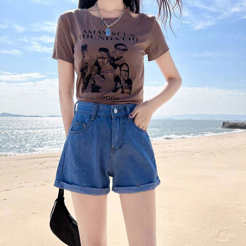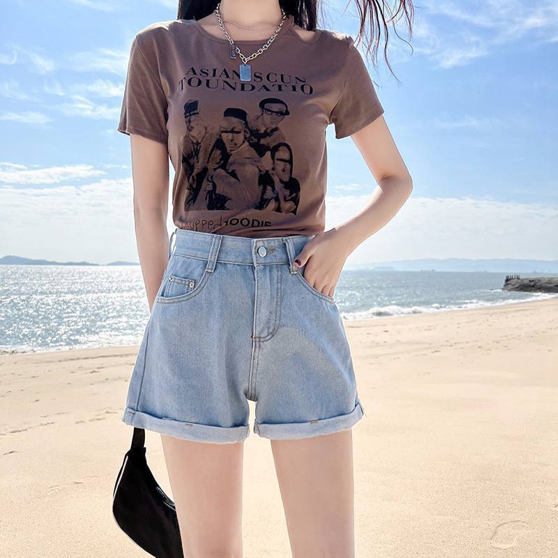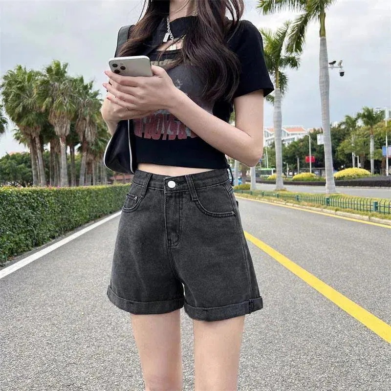 レディース デニムショートパンツ ロールアップデザイン ストレートシルエット ハイウエスト 美脚見せ ワイド感 カジュアル 韓国風 春夏新作 人気アイテム