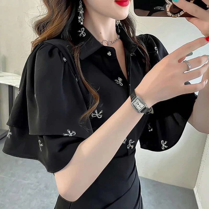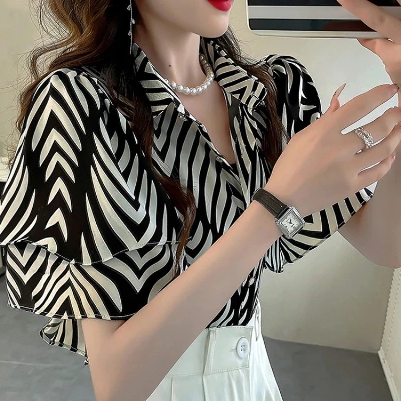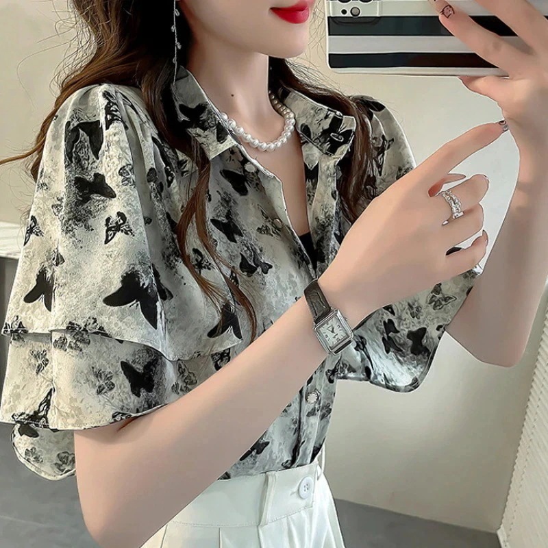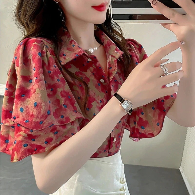 レディース シアーシャツ 半袖ブラウス UVカット フリルデザイン 透け感 軽やか素材 プリント柄 夏先取り 韓国ファッション おしゃれ 人気アイテム