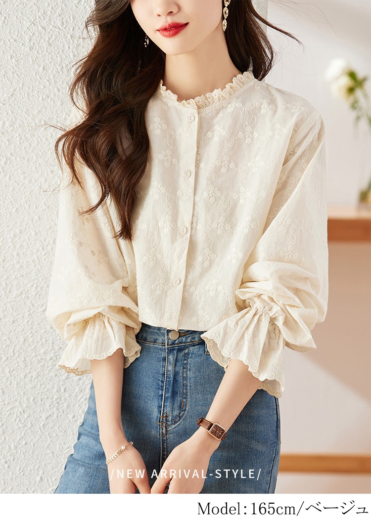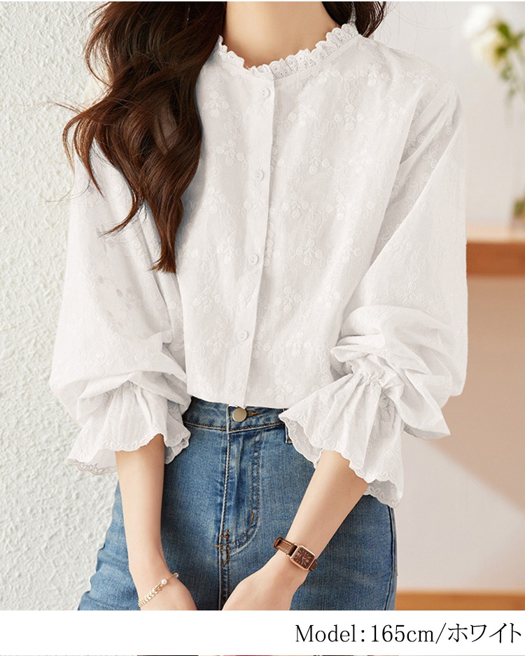 ブラウス レディース レースコットン100%フリル襟立ち襟長袖花柄刺繍春秋フォーマルトップス シャツ ブラウスゆったりおしゃれきれいめ通勤カジュアル可愛い体型カバーオフィス通勤着回し