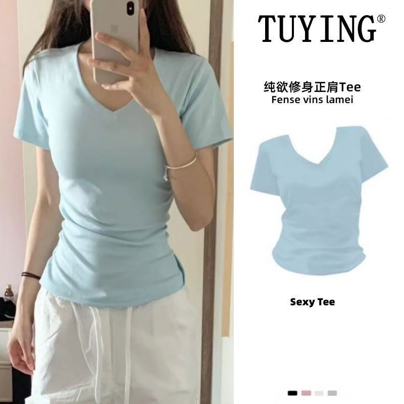 無地Vネック半袖Tシャツ レディース 夏の新作 セクシーでスリムなシルエットのストレートショルダー半袖トップス レディース 半袖インナーTシャツ・クルーネックスウェット