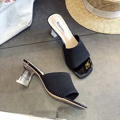 4色 ニットスリッパ 女性 厚いヒール ミドルヒール スクエアヘッド オープントゥ サンダル フ