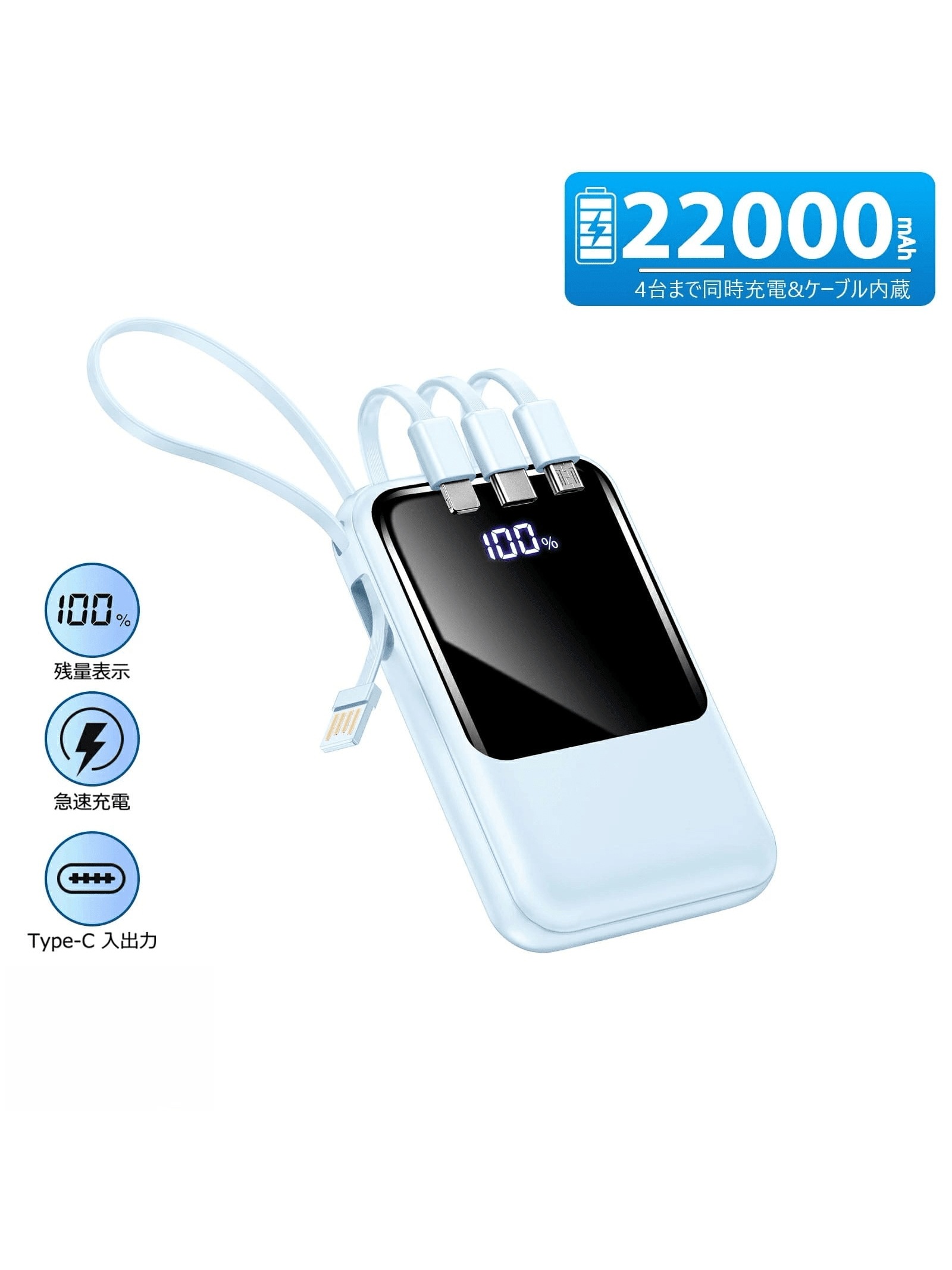 「22000mAh / 4台同時充電 」 モバイルバッテリー 4ケーブル内蔵  超軽量 小型 防災対応 LED残量表示 携帯充電器 i phone/Android全種機器対応 コンパクト