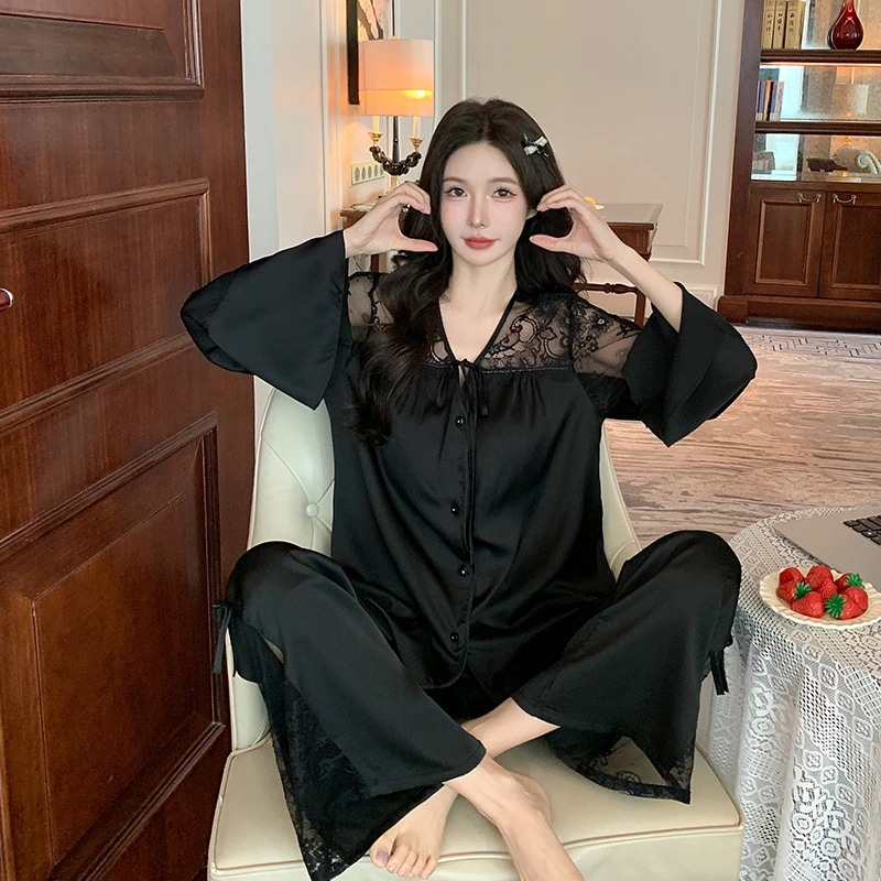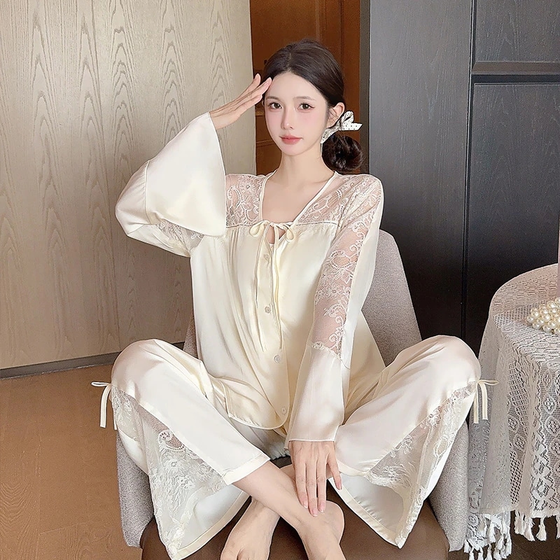 2026 春夏 パジャマ セットアップ 新作 長袖 サマー アイスシルク デザイン感 フレンチ レース ルームウェア セットアップ 上下セット レディース