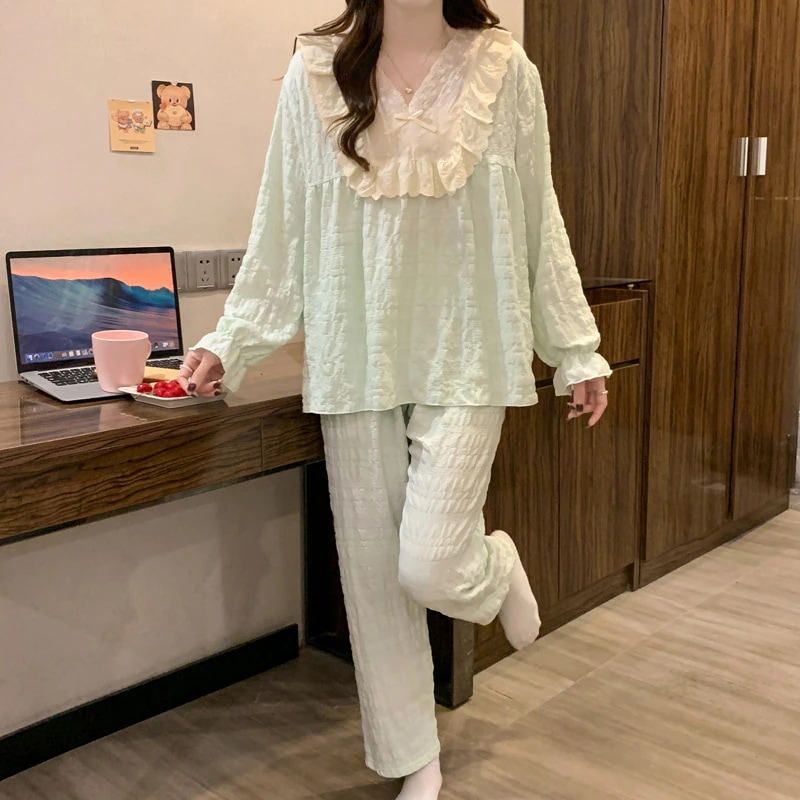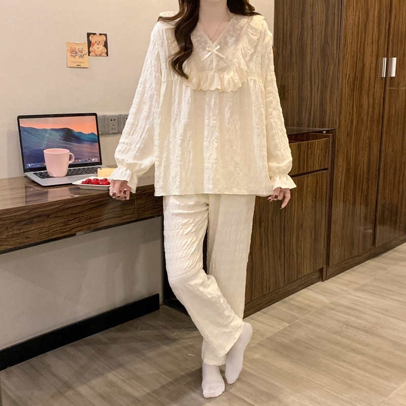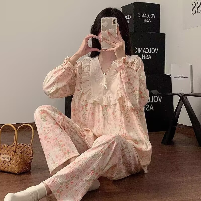 2026 春夏 パジャマ セットアップ 新作 蝶結び セットアップ 韓国ファッション 長袖 ドット柄 トップス パジャマ 上下セット レディース
