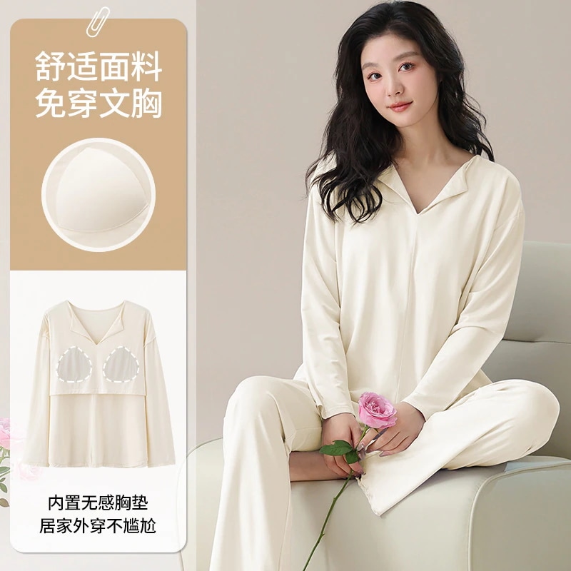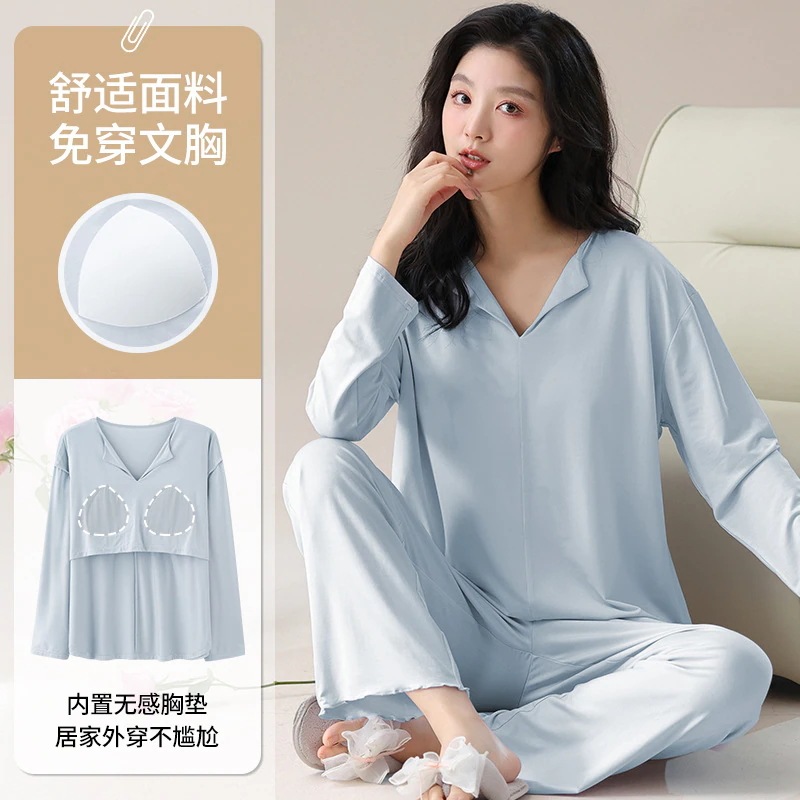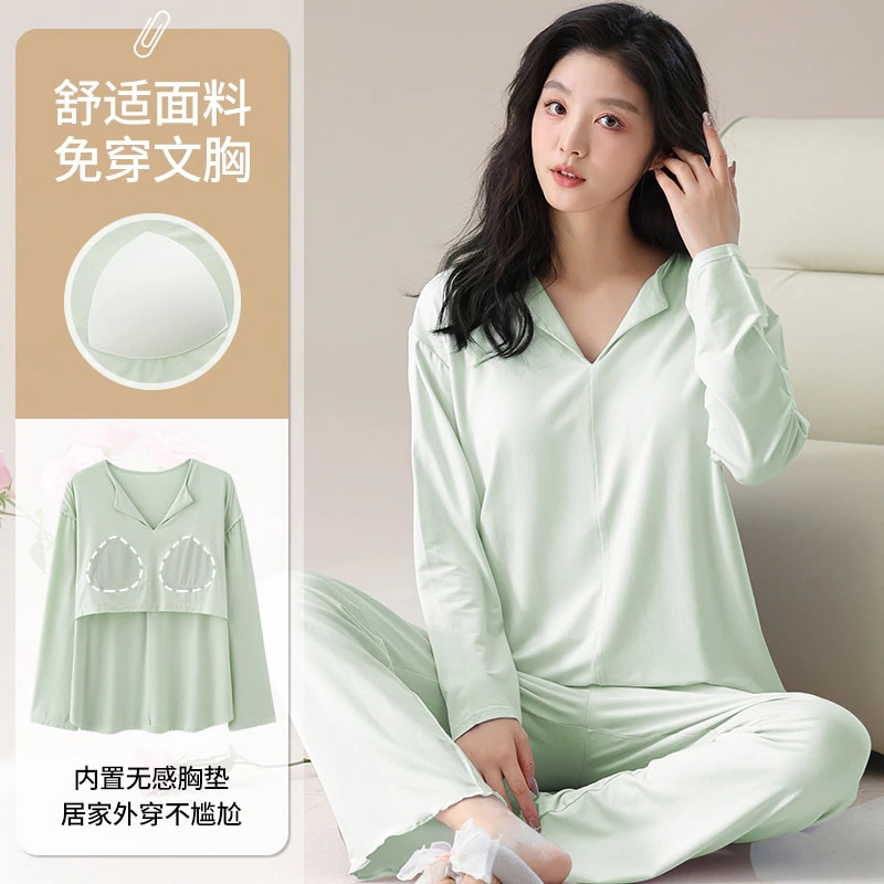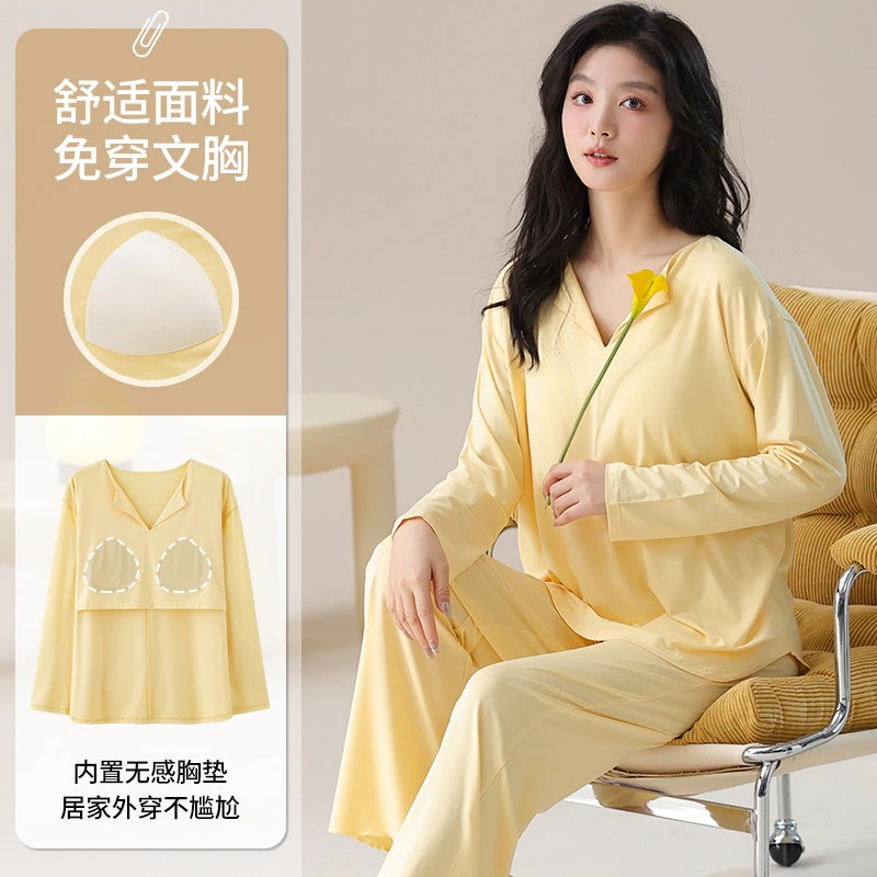 2026 春夏 パジャマ セットアップ 新作 カップ付き 薄手 ゆったり 長袖 無地 ルームウェア セットアップ 上下セット レディース