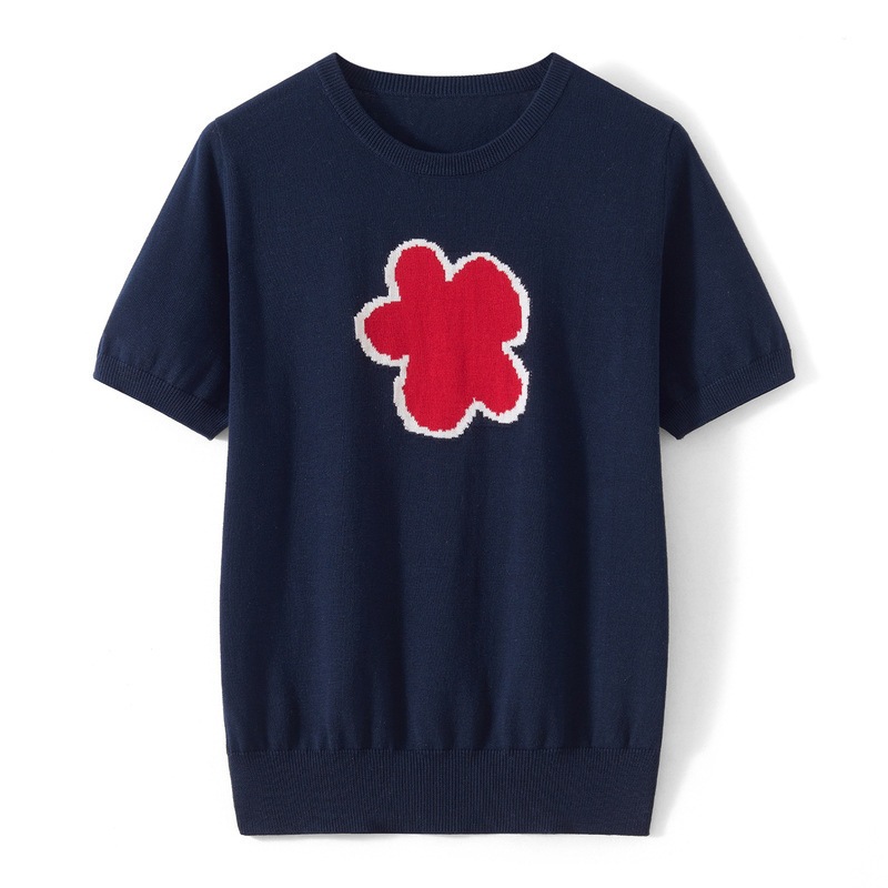 春夏の新しい女性のニットの丸首の純綿の頭の半袖の1輪の小さい紅花の設計の甘い美しい風のtシャツ
