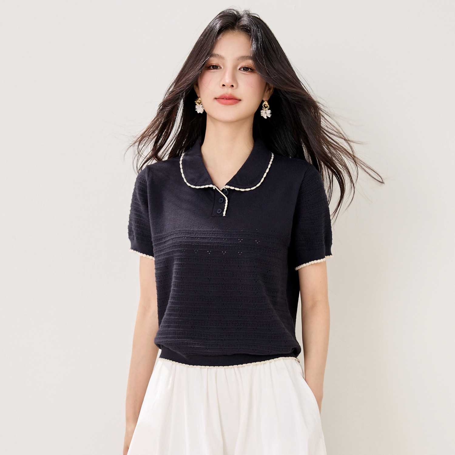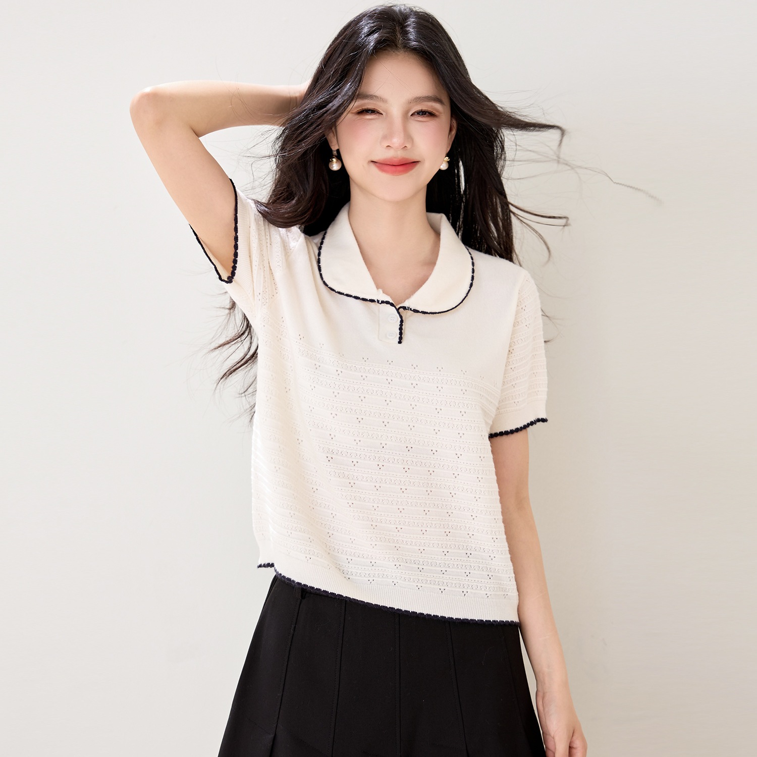 甘い風の乳の白い子供の襟の頭のニットの女性の2026夏の新型の薄いタイプの快適な半袖の底のシャツ