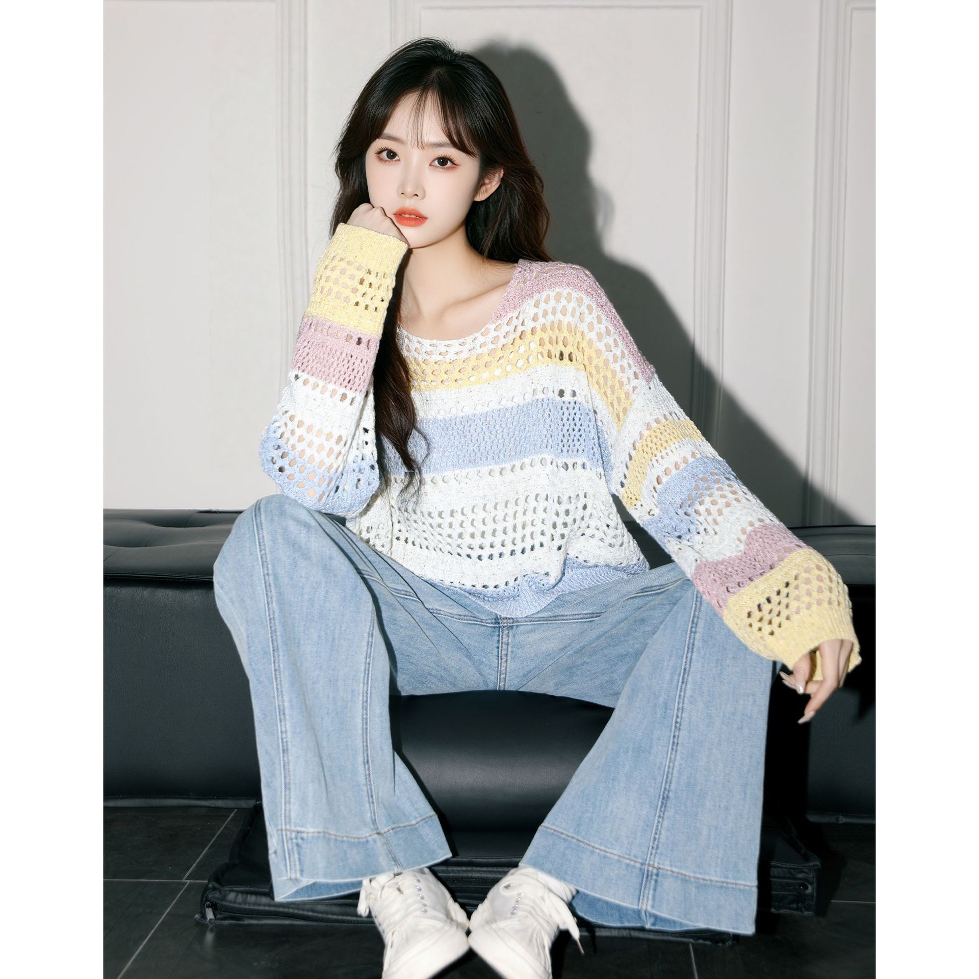 ストライプ柄の透かし編み長袖ニットカーディガン レディース 春夏新作 デザイン性ルーズフィット・ストラップトップ・アウター
