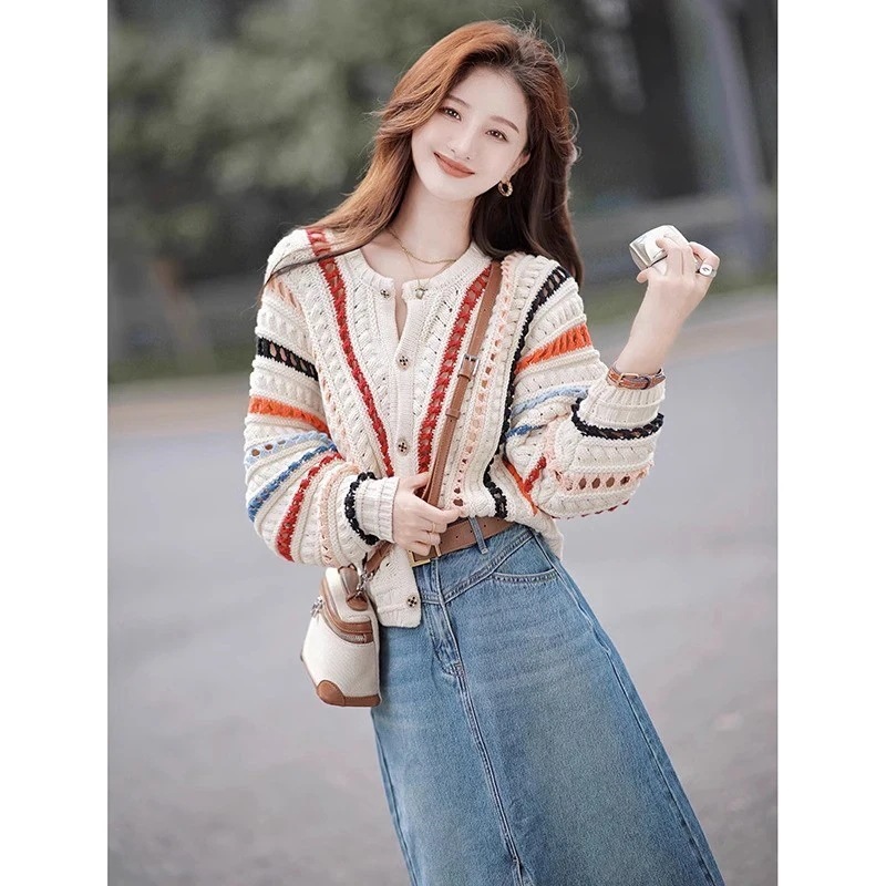レディース 秋冬新作 カラーストライプセーター ルーズフィット ラフな雰囲気 クロシェ編み 透かし編み ニットトップス アウター