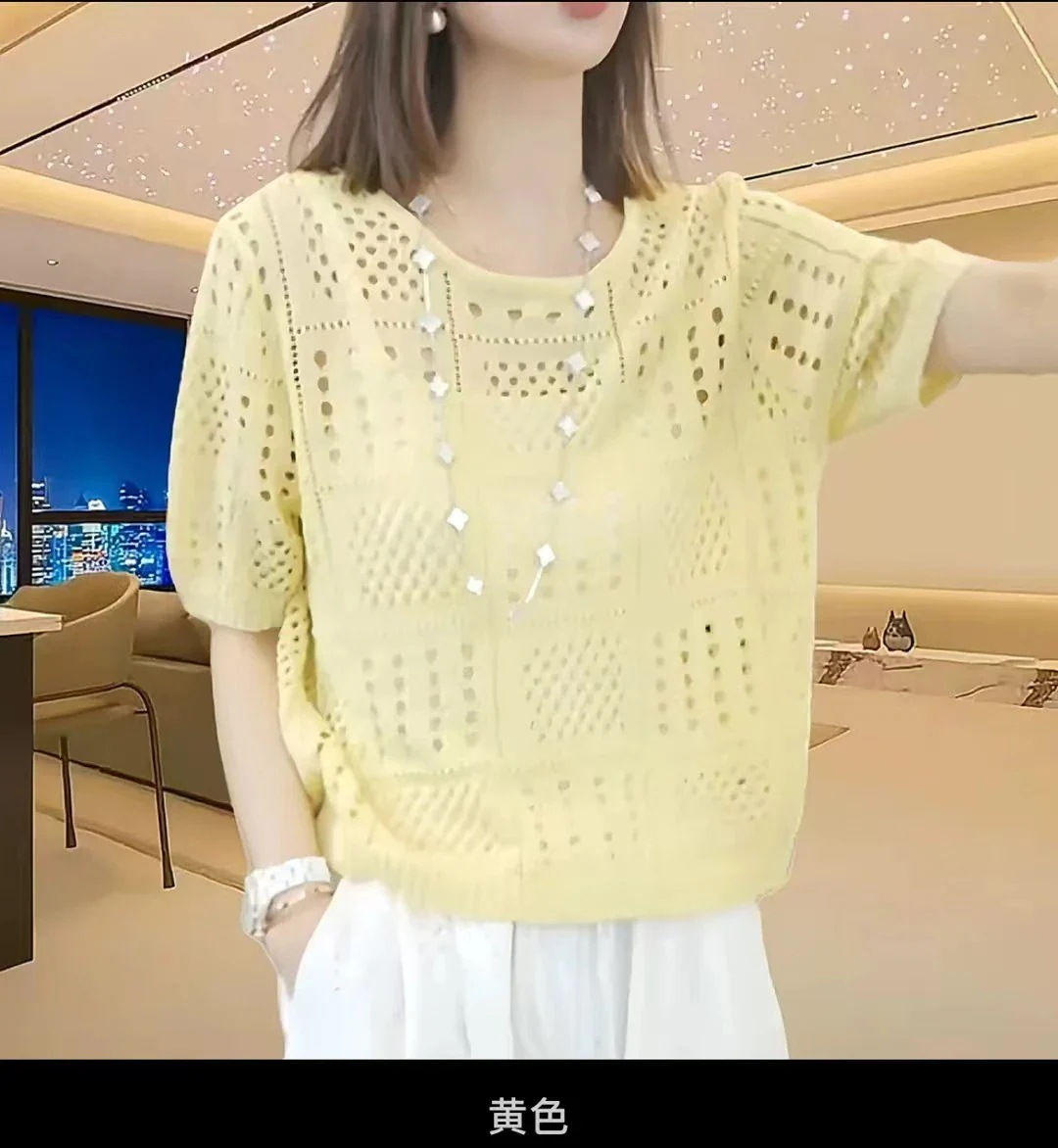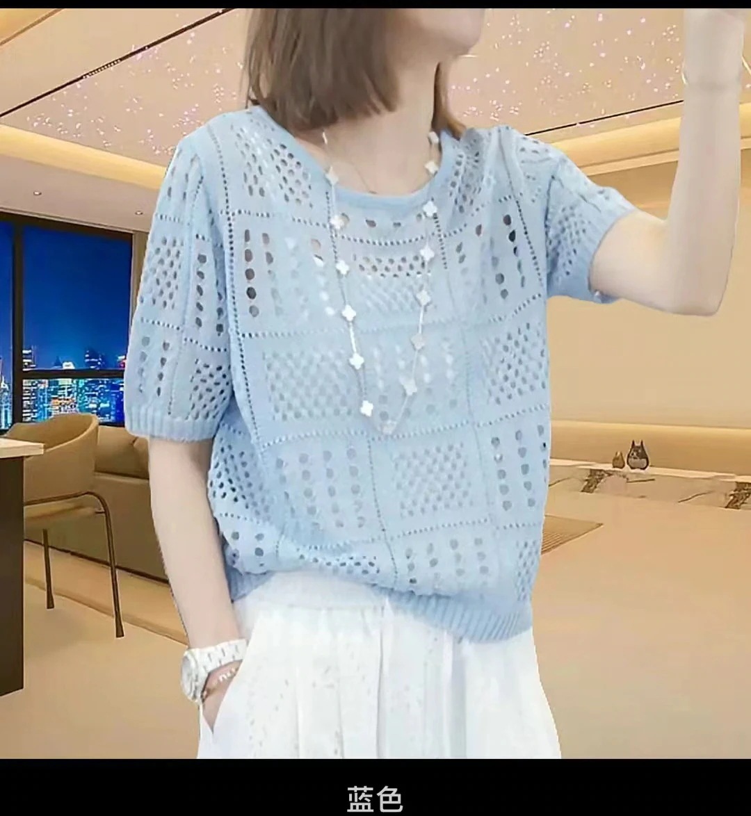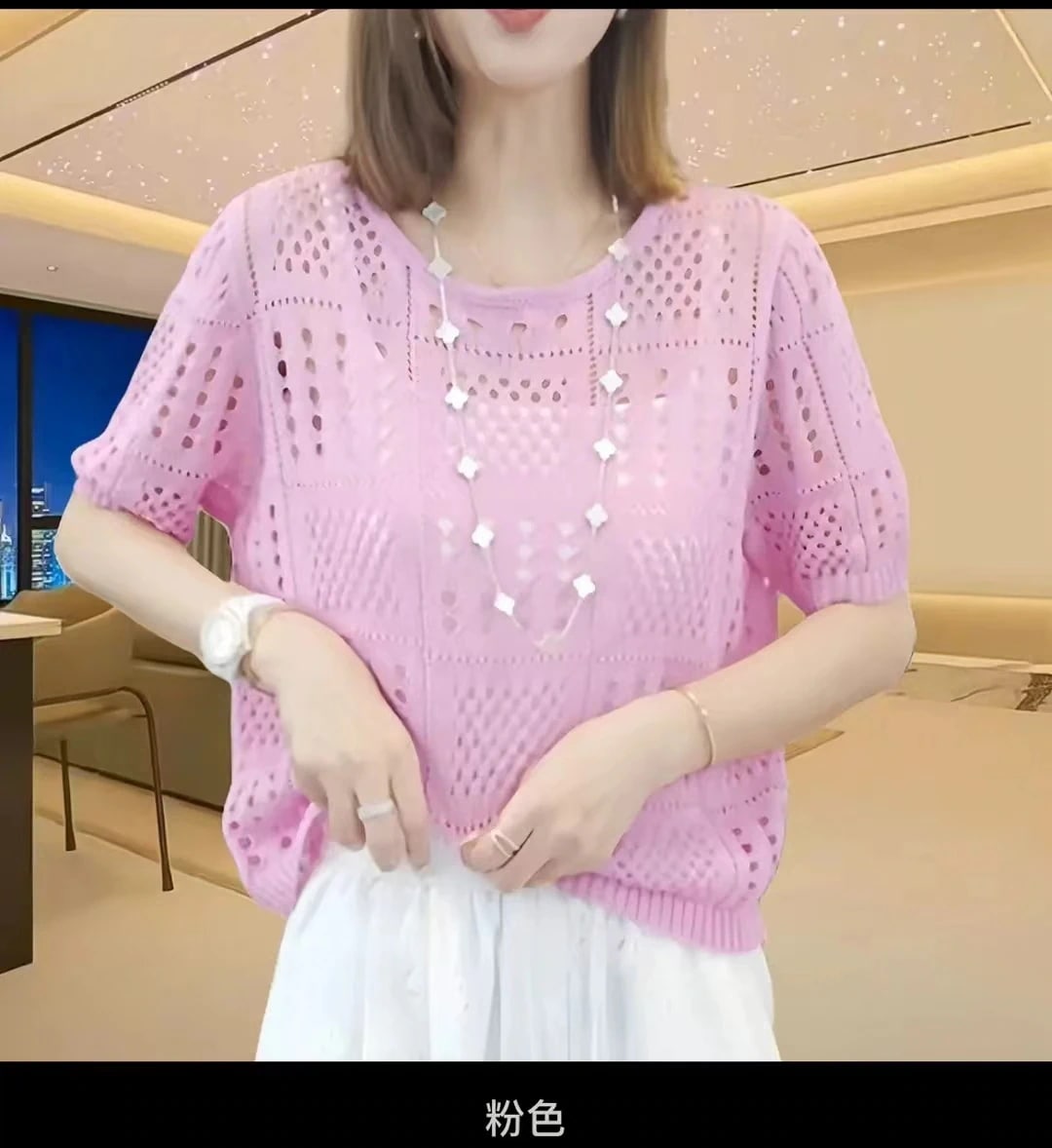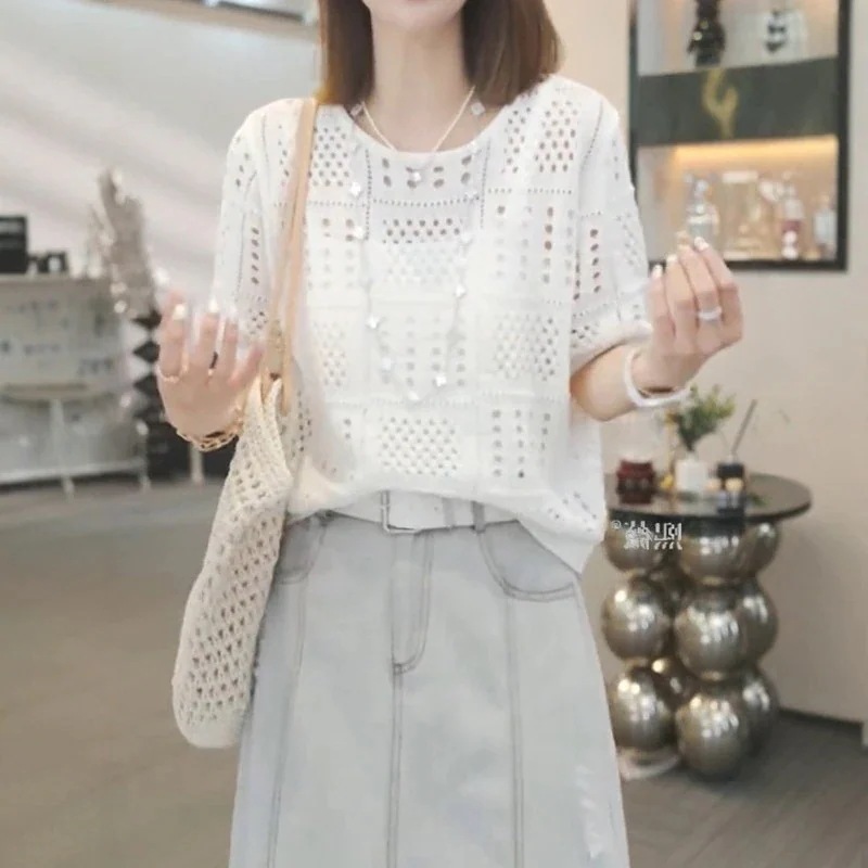 レディース 夏の新作 大きめサイズ 優しい雰囲気 透かし編み 丸首 半袖Tシャツ ぽっちゃり体型の方にも似合う スリム効果 ゆったりシルエット どんなスタイルにも合わせやすいトップス