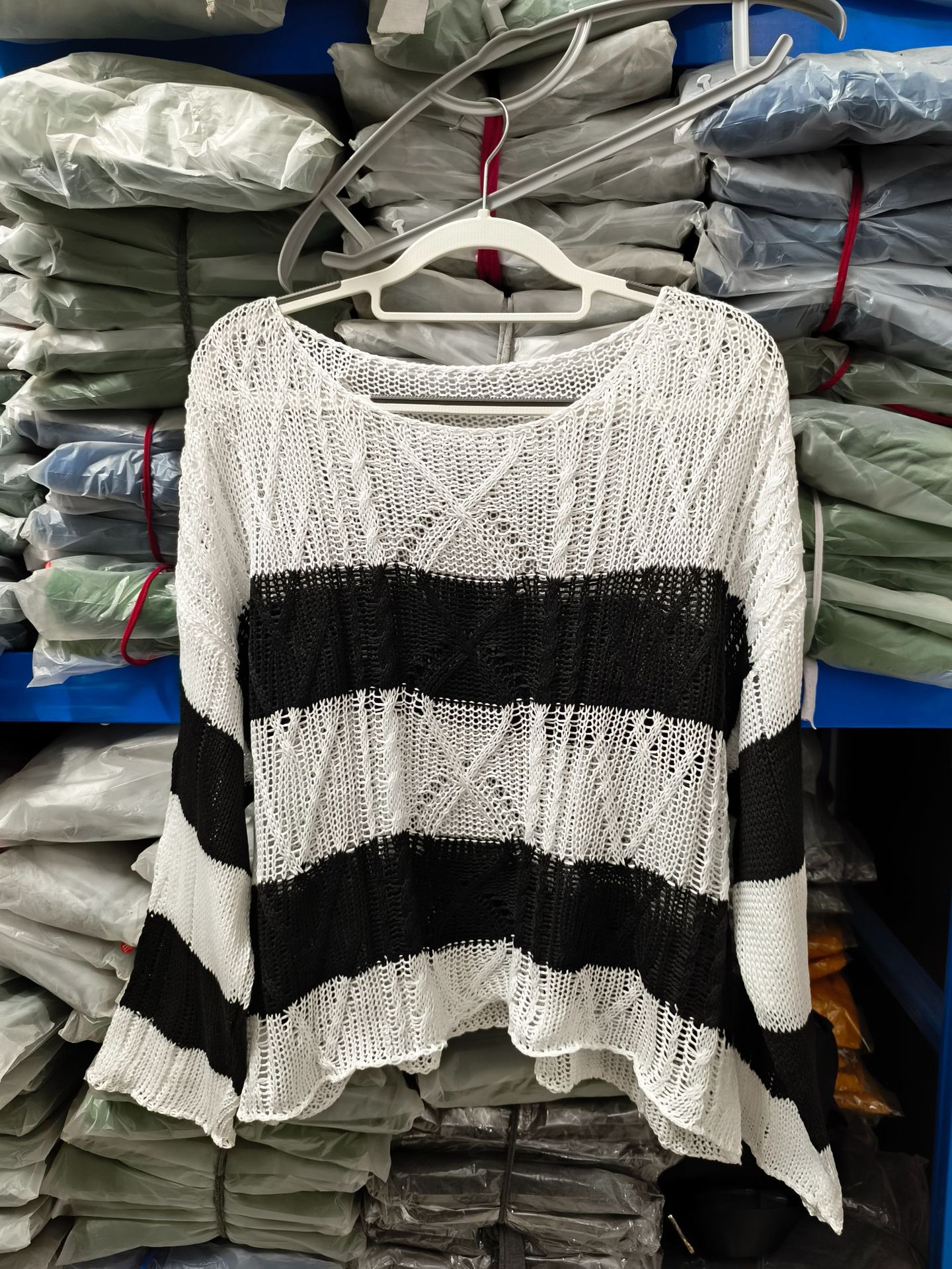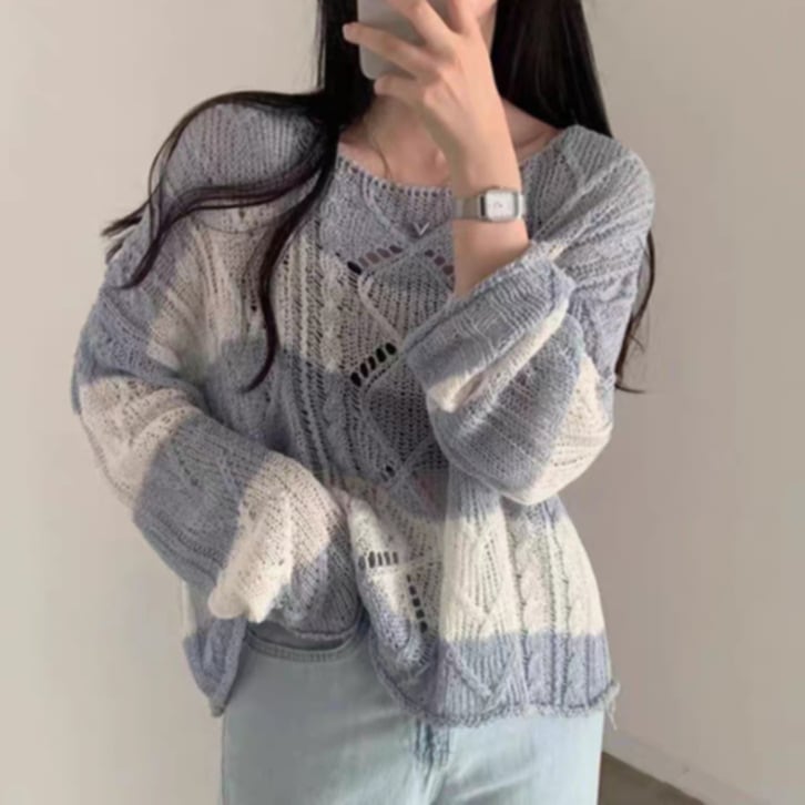 韓国風レトロな編み込み柄のショート丈長袖ストライプUVカットニットトップス 薄手・ルーズフィット・デザイン性レディースカーディガン