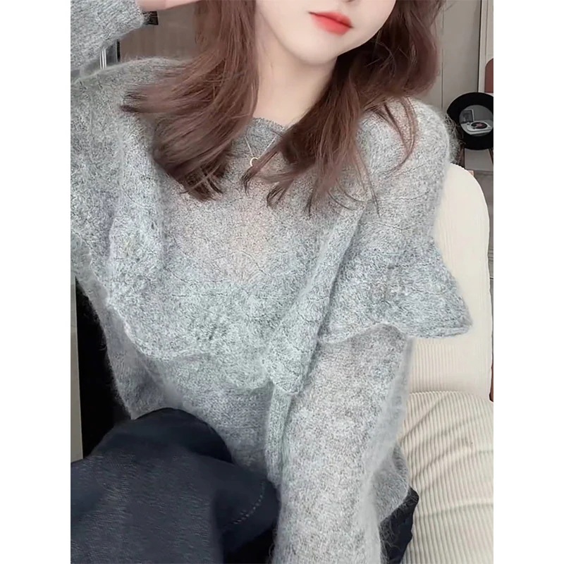 春のコーディネート:クロシェ編みの透かし編みセーター(レディース) フリル付き グレー 着心地柔らかくふんわりとしたルーズフィット どんなスタイルにも合わせやすいラウンドネックニットトップス