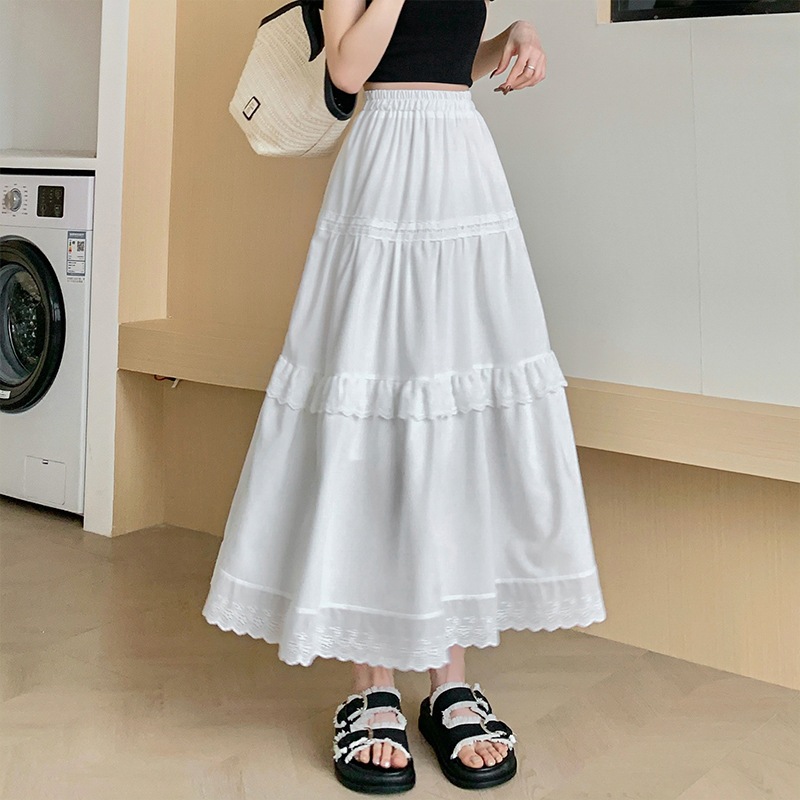 ホワイトのケーキスカートハイウエストでスリムに見えてどんなスタイルにも合わせやすいスカート韓国風の優しい雰囲気キュートなゴムウエストフェアリー風のミディ丈スカート