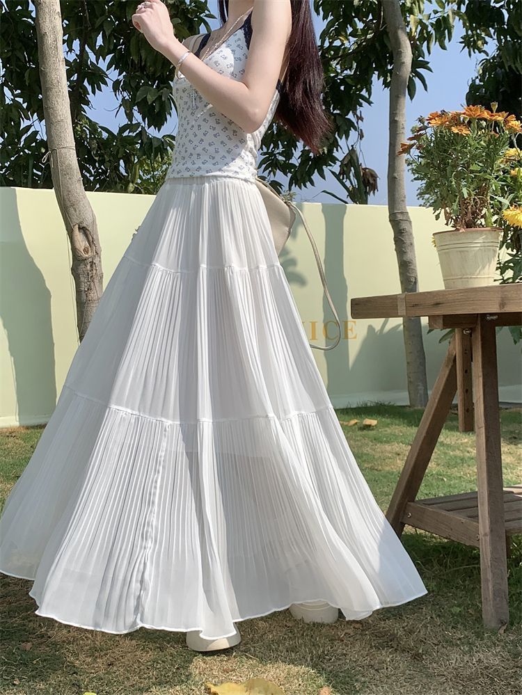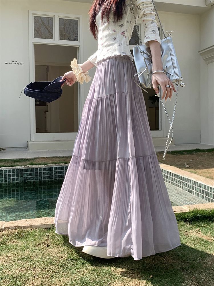 シフォン素材のプリーツスカート(レディース・春夏用)ハイウエストでスリムに見えるAラインミディ丈スカート 優しくて甘い雰囲気のドレープ感あるロングスカート