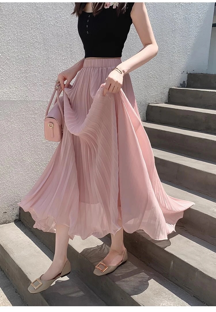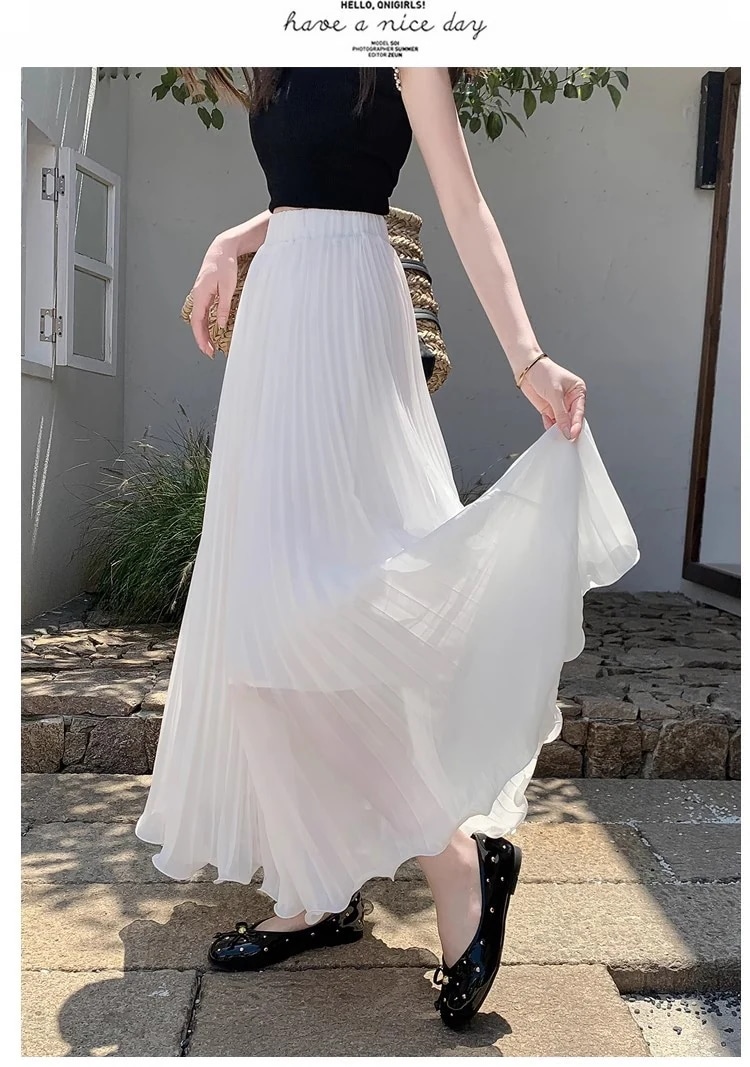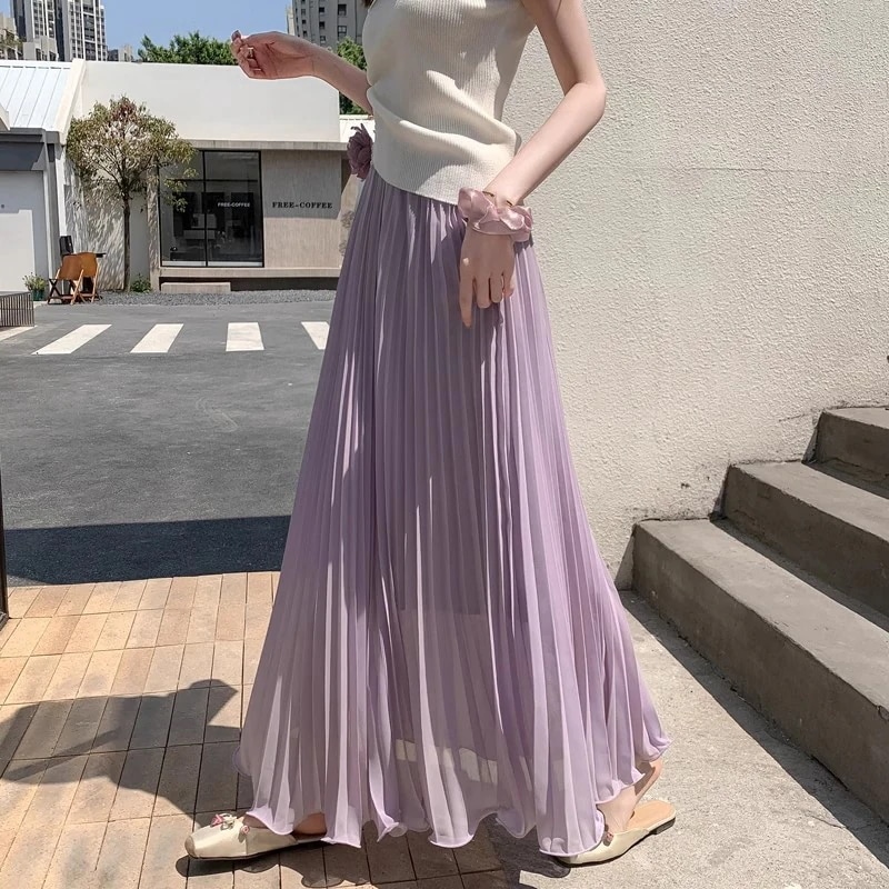 プリーツスカート(レディース) 早春新作 ニッチなプリーツスカート ハイウエスト スリム効果 ドレープ感のあるシフォン素材 ロング丈