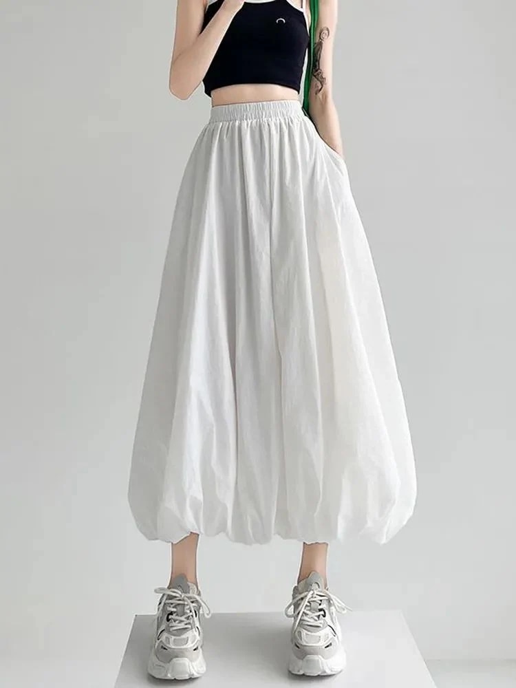 薄手で速乾性ポケット付きの花柄スカート夏の新作無地ゴムウエストスリム効果のあるミディ丈ラフな雰囲気のスカート