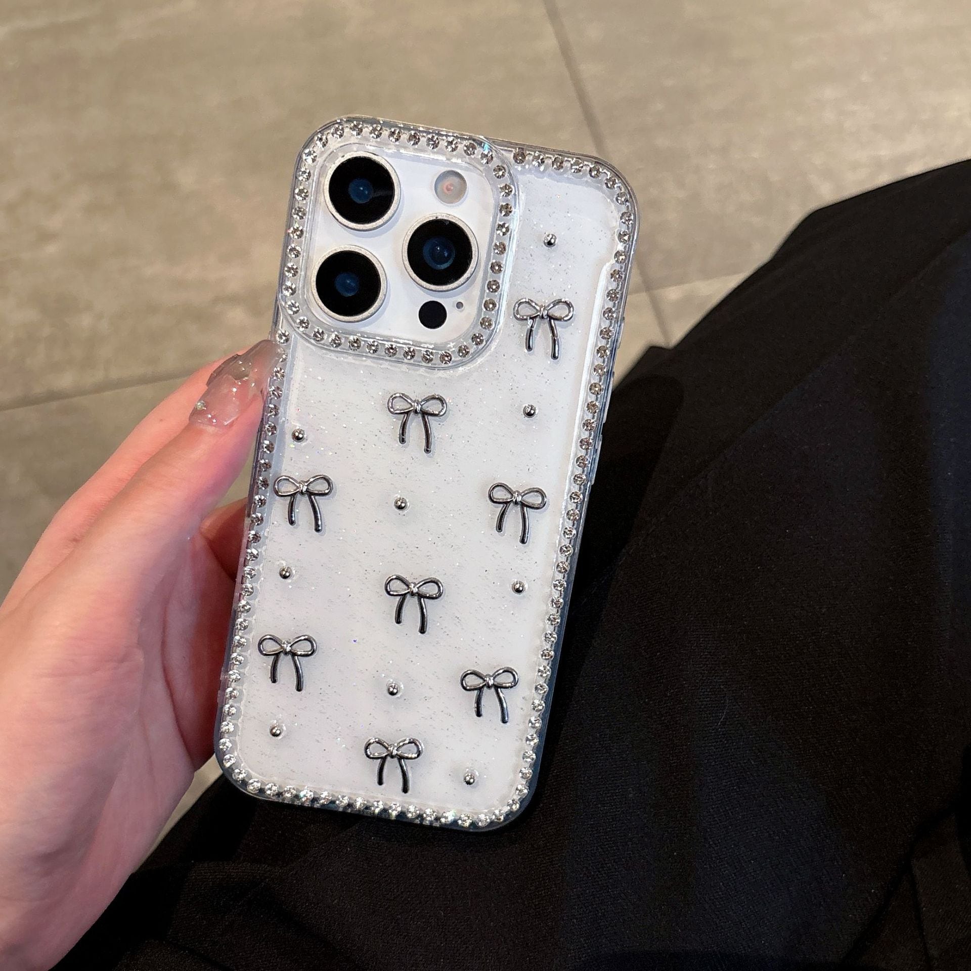 【送.料.無.料】スマホケースラメ 立体 シルバーパール リボン iPhone16/17 Pro アップル14/13 Pro 女性用