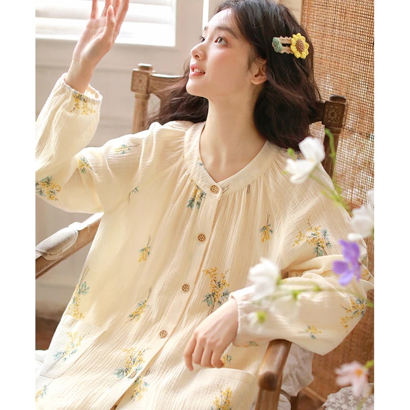 2026 春夏 パジャマ セットアップ 薄手 綿 纱布 パジャマ 長袖 カーディガン カジュアル ロングパンツ パジャマ セットアップ 上下セット レディース