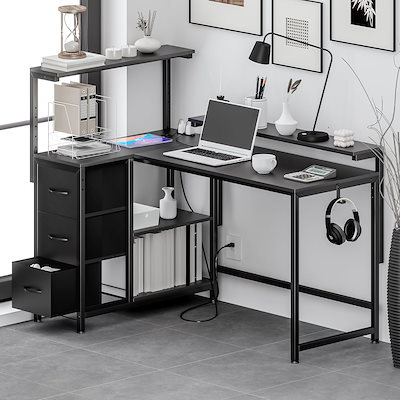 「左右交換 棚板高さ調整可」MoonMeguri ラック付きデスク 可動モニター台・引き出し付き 幅130奥行80高さ72cm 7段調節モニター台(12-36) L字 コーナー対応 左右交換