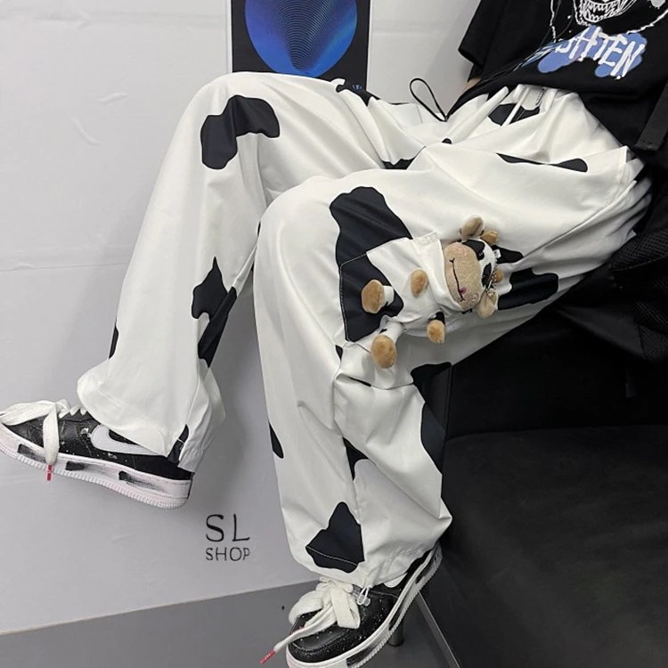 パンツ レディース メンズ ワイドパンツ 乳牛柄 ぬいぐるみ 白パンツ おしゃれ ウエストゴム ズボ