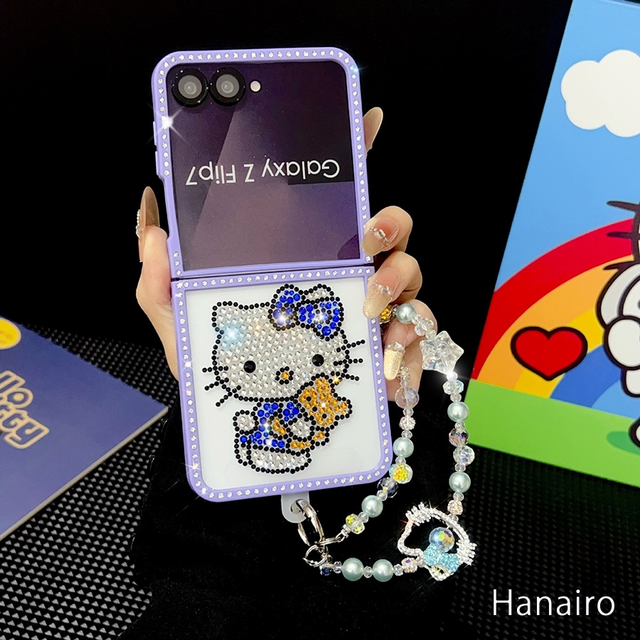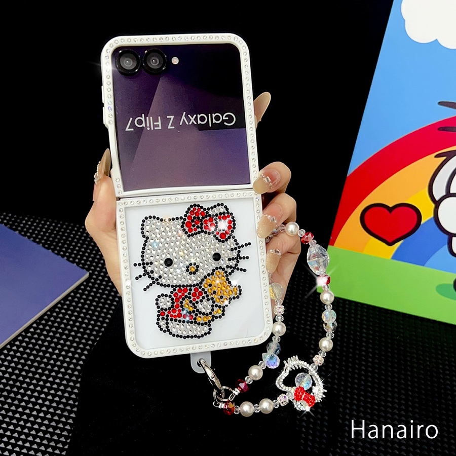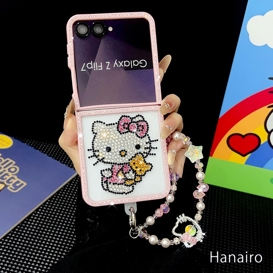 Galaxy韓国人気 ハンドメイド galaxy z flip7 ケース ハローキティ キラキラ ラインストーン flip6/5/4/3 ケース ストラップ付きスマホケース