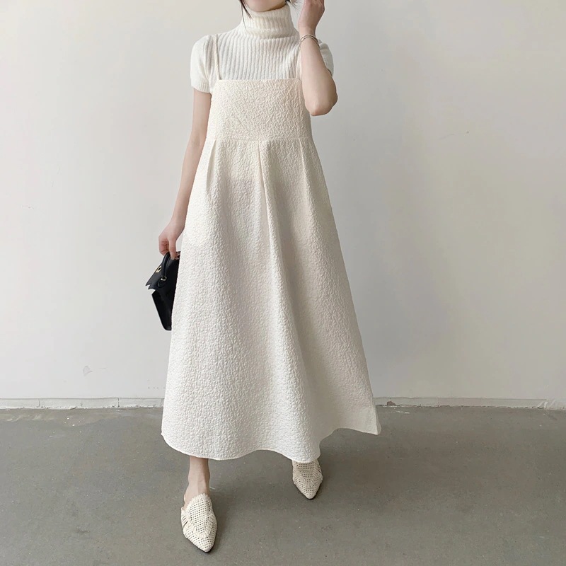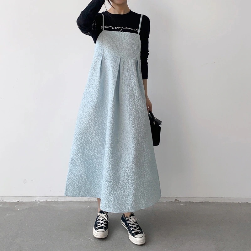 韓国 春新作 プリーツフレア Aライン ノースリーブ ロングスカート ストラップ ワンピース ドレス キャミワンピ