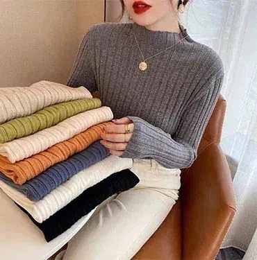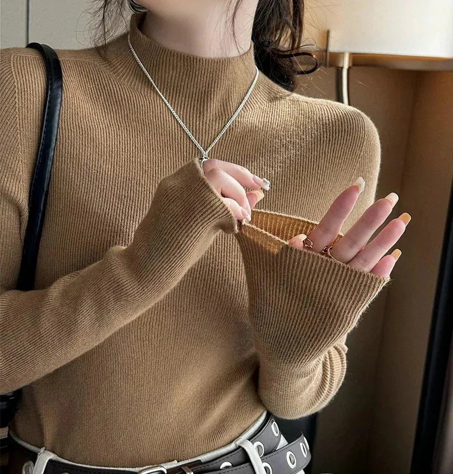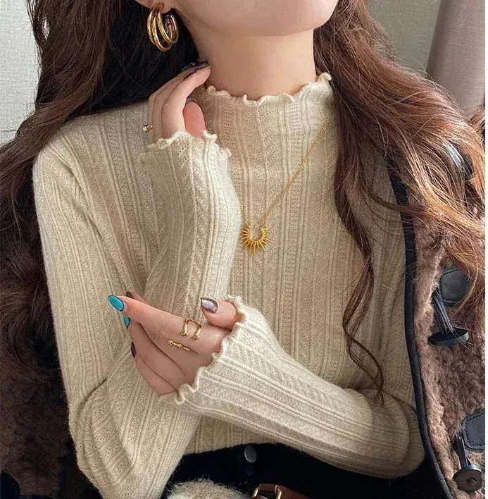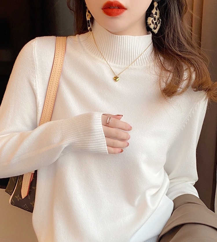 韓国ファッション リブニットトップス 無地 長袖 スリット リブ ストレッチ ニットハイネック Tシャツツ オフタートルネック レディース タートルネックニット リブ
