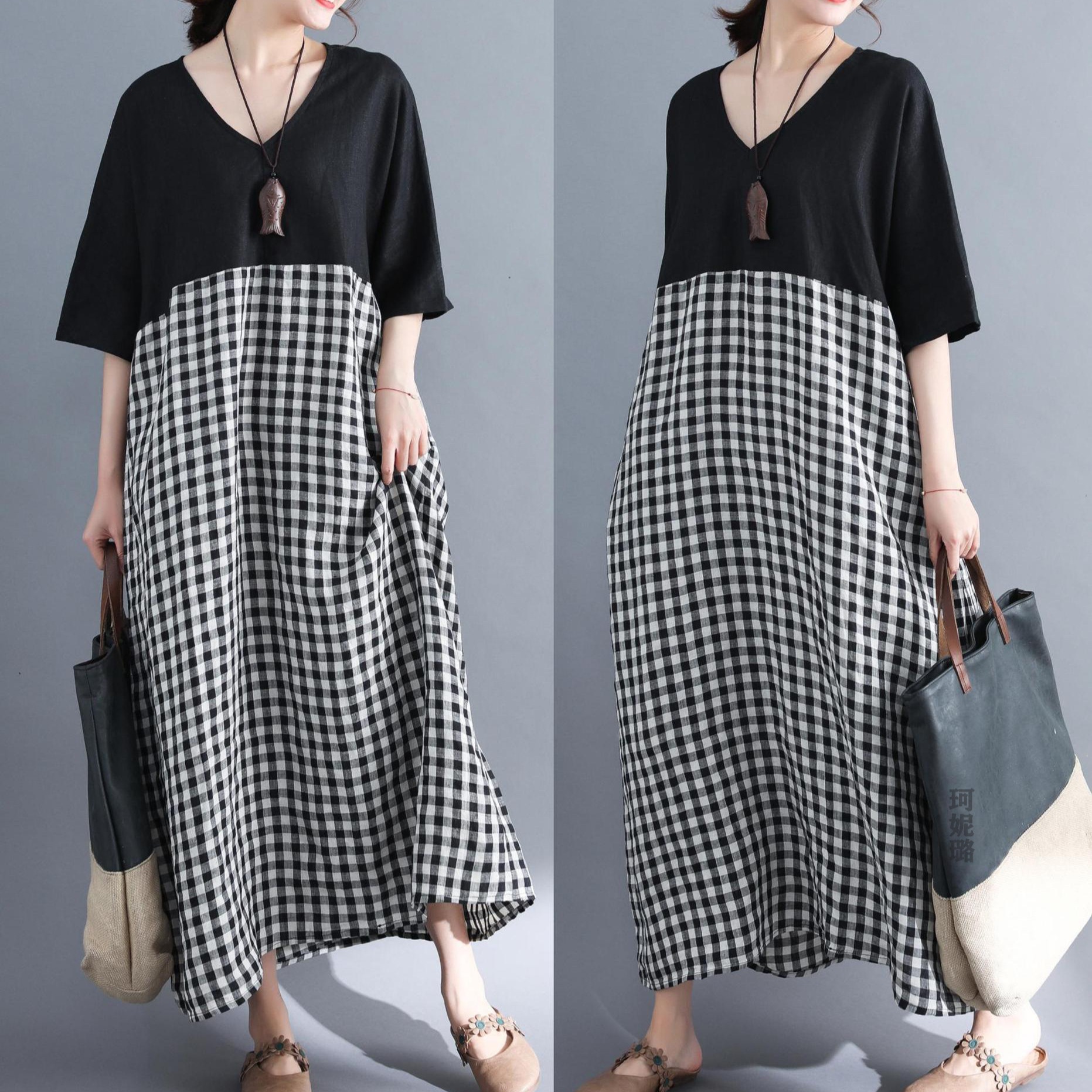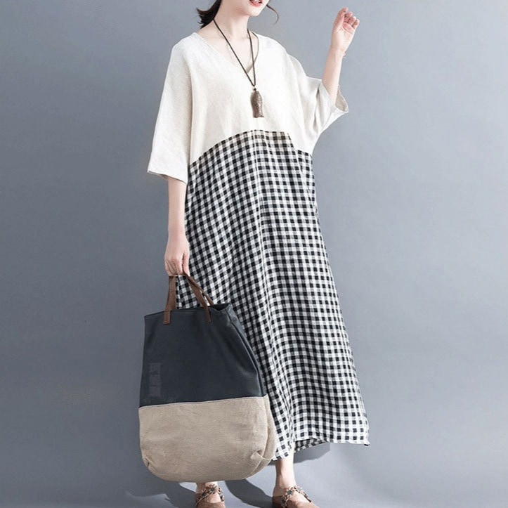 25の新作韓国風ゆったりとしたコントラストカラー パッチワークデザインのアマニチェック柄大サイズレディースワンピース