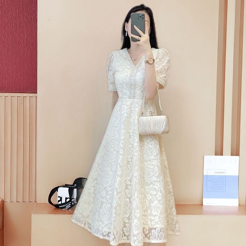 気品の名媛の高級感のレースのワンピース2026夏の新型の小さい人は腰を収めてやせている中で長い字のスカートを現します