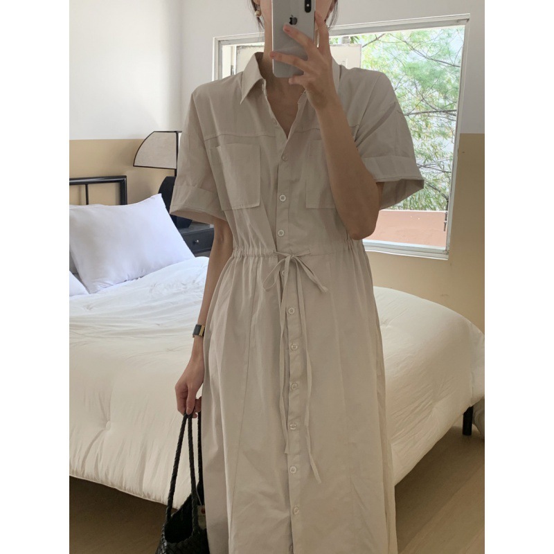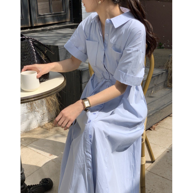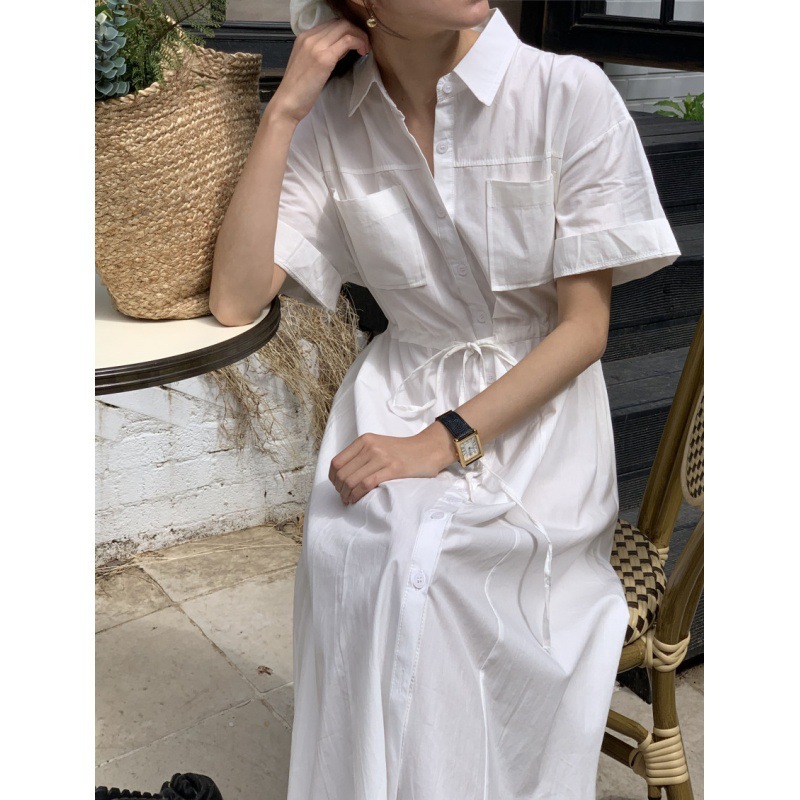 韓国のchi夏の優雅な気質の襟のダブルポケットのベルトは腰を収めてやせている半袖のシャツのワンピースの女性を現します