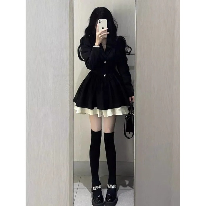 太ったmmフランスの高級感の雰囲気の黒いスーツのワンピースの女性の秋の大きいサイズは腰を収めてやせている王女の蓬蓬のスカートを現します