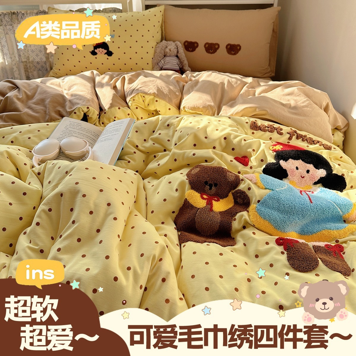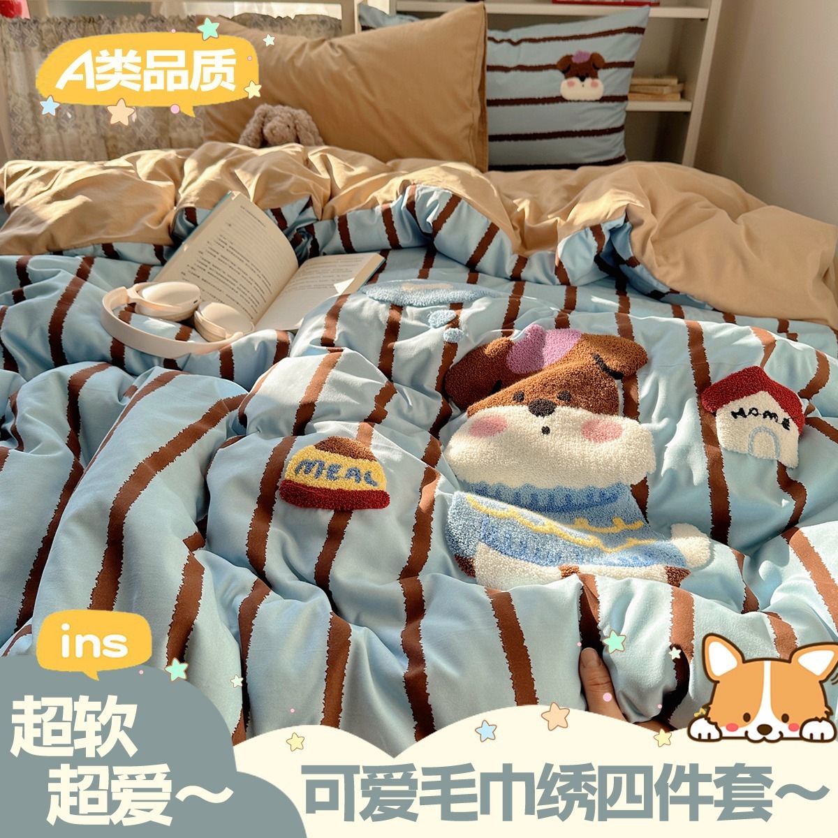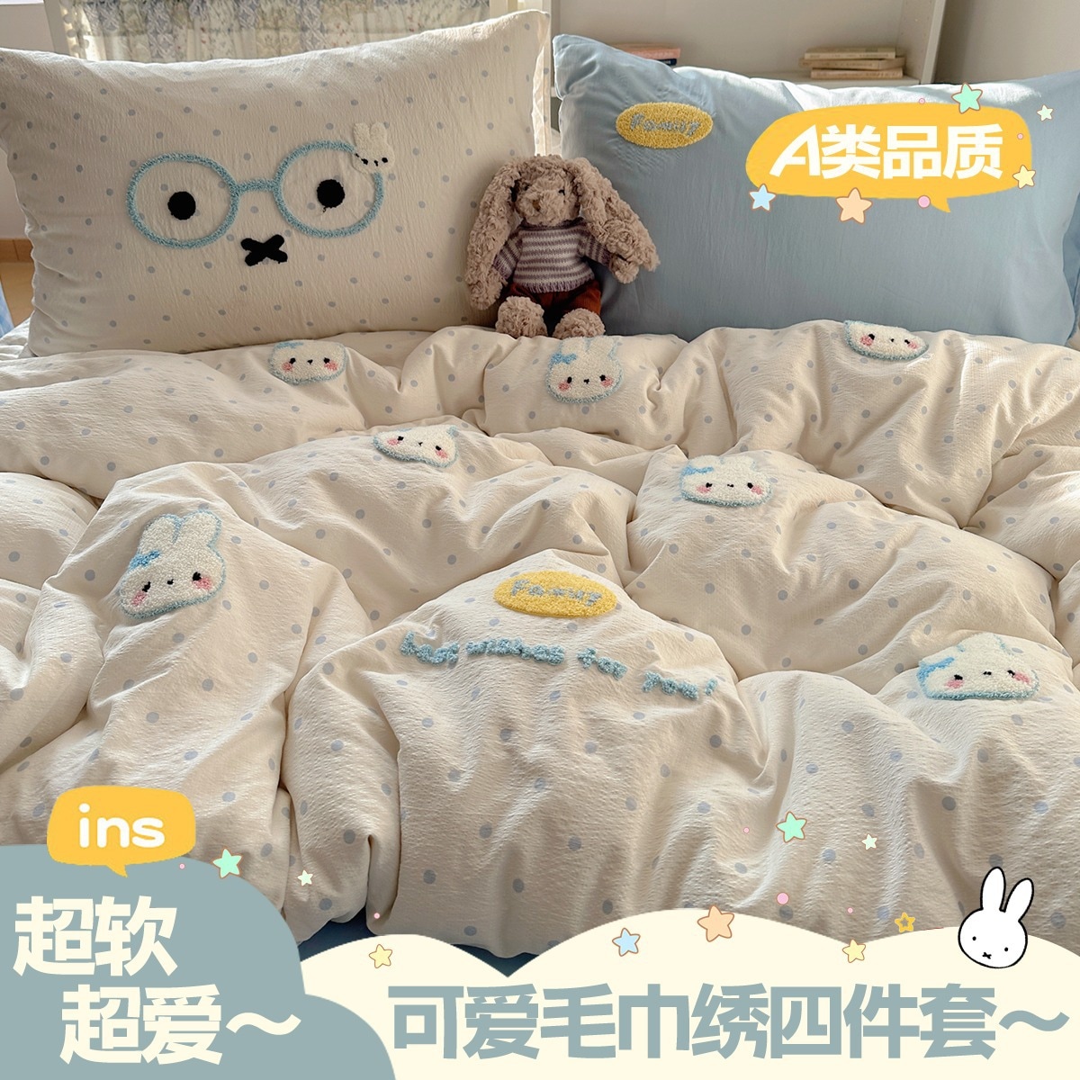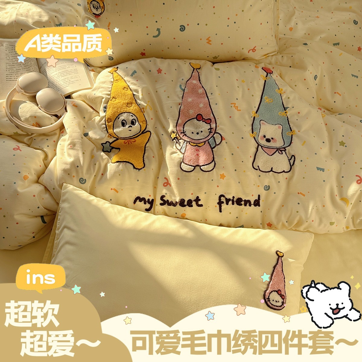 カートゥーン タオル刺繍 コットン100% ベッド4点セット 素肌に優しい かわいい 清新 純綿 シーツ カバー 寮 3点